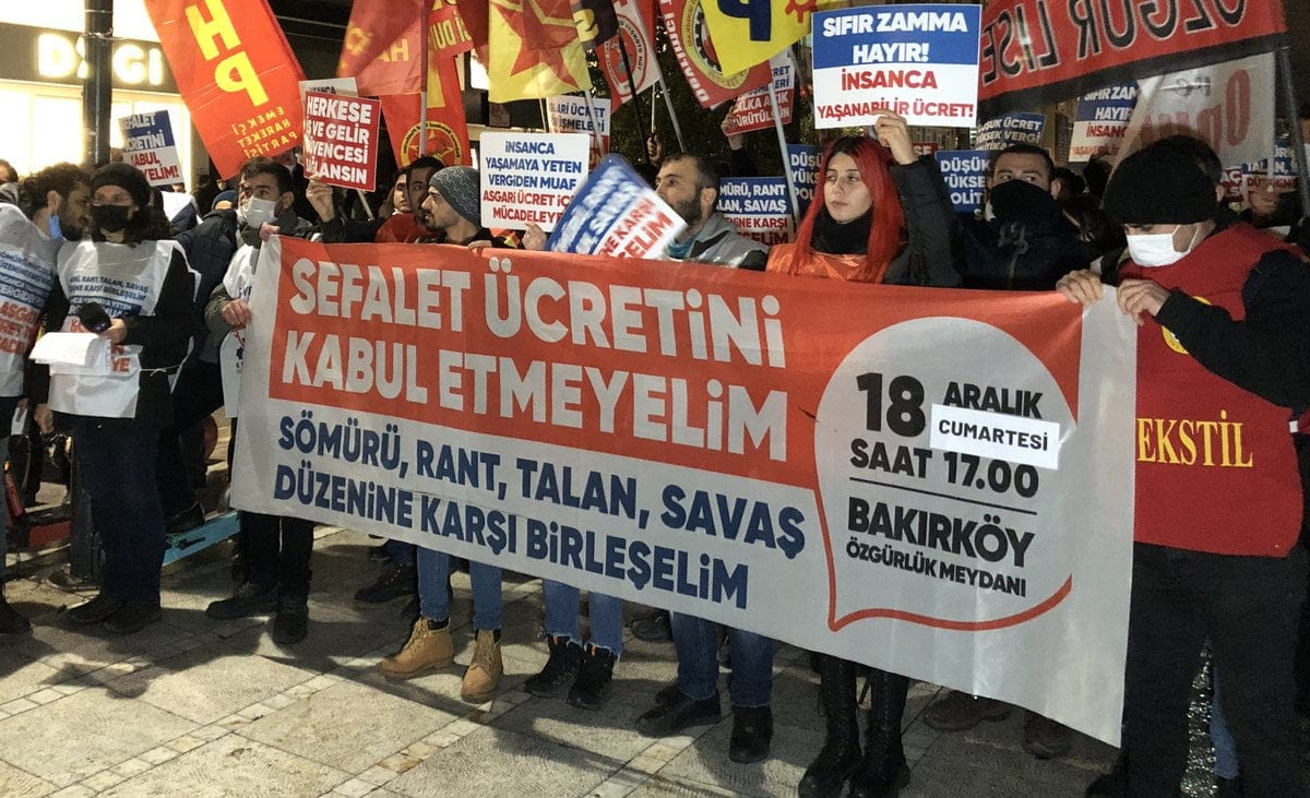 İSTANBUL – Asgari Ücret Tespit Komisyonu’nun 4. toplantısı sonrası AKP’li Cumhurbaşkanı Erdoğan, TİSK ve Türk-İş  asgari ücreti 4 bin 250 TL olarak açıkladı. “Asgari Değil İnsanca Yaşam İstiyoruz” Bileşenleri, Kadıköy’deki Süreyya Operası önünde, “Sefalet ücretini kabul etmeyelim. Sömürü, rant, talan, savaş düzenine karşı birleşelim” yazılı pankartla açıklama yaptı.