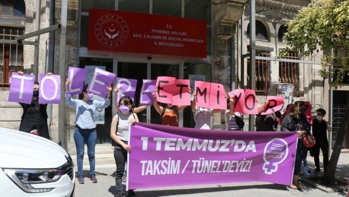 İstanbul Sözleşmesi’ni Uygula Kampanya Grubu, Fatih’te bulunan Aile, Çalışma ve Sosyal Hizmetler İl Müdürlüğü önünde İstanbul Sözleşmesi’nden çekilme kararını protesto etti. Grup, 1 Temmuz’da Taksim Tünel’de yapılacak eyleme de çağrıda bulunuldu. Kadınlar, “1 Temmuz’da Taksim Tünel’deyiz” pankartının yanı sıra “Tolere etmiyoruz” dövizlerini taşırken, sık sık “Boşanmayı değil, cinayeti engelle”, “Yaşasın kadın dayanışması” ve “Susmuyoruz, korkmuyoruz itaat etmiyoruz” sloganlarını attı.