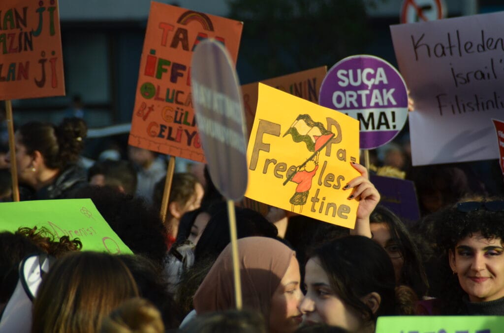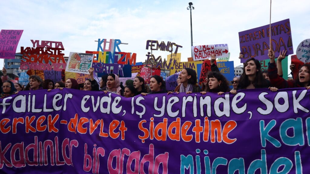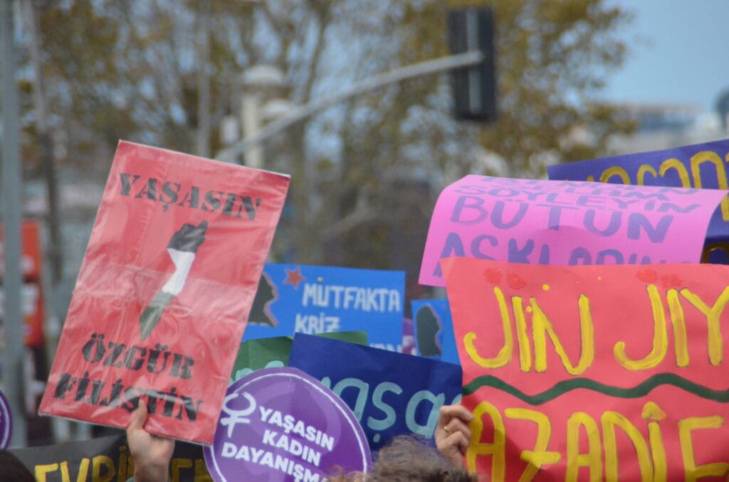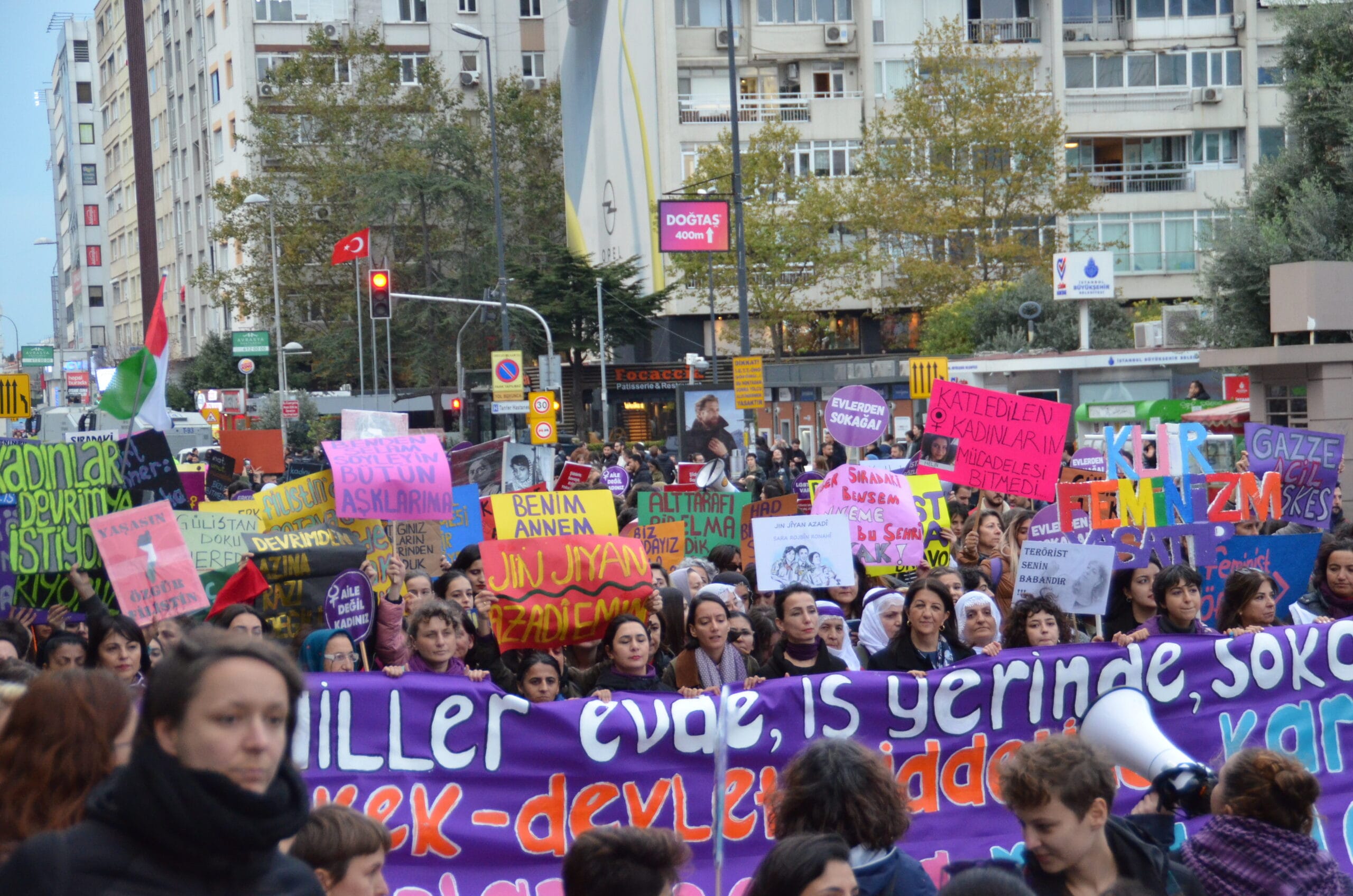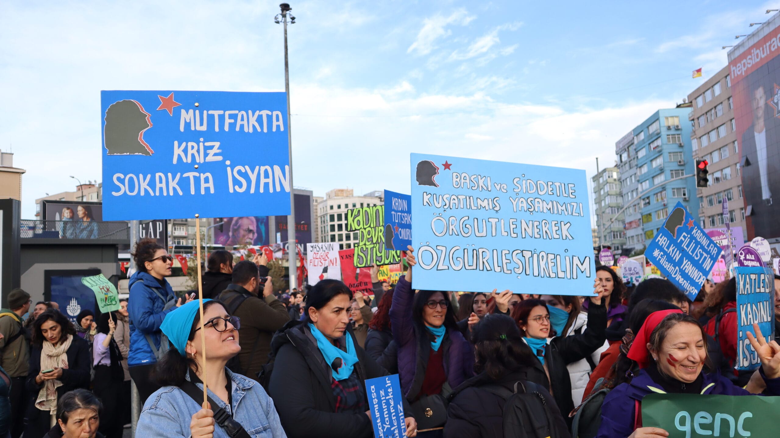 Mecidiyeköy’ün ara sokaklarından sloganlarla yürüyerek meydana gelen kadınların dövizlerinde Siyonist İsrail’in Filistin halkına dönük soykırım saldırıları, kadın cinayetleri, KYK yurdunda ihmal sonucu katledilen Zeren Ertaş, deprem katliamı, yoksulluk ve kadın sömürüsü, AKP-MHP iktidarının makbul kadın ve aile dayatması, LGBTİ+’lara dönük fobi, Rojava’ya yönelik işgal saldırıları ve cinsel, fiziksel, psikolojik erkek şiddeti ön plana çıktı.
