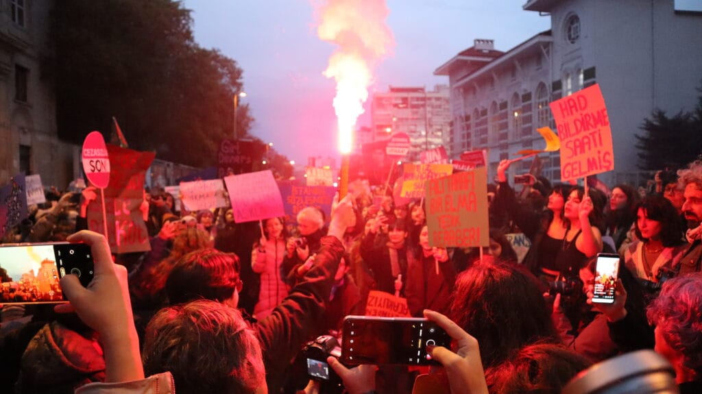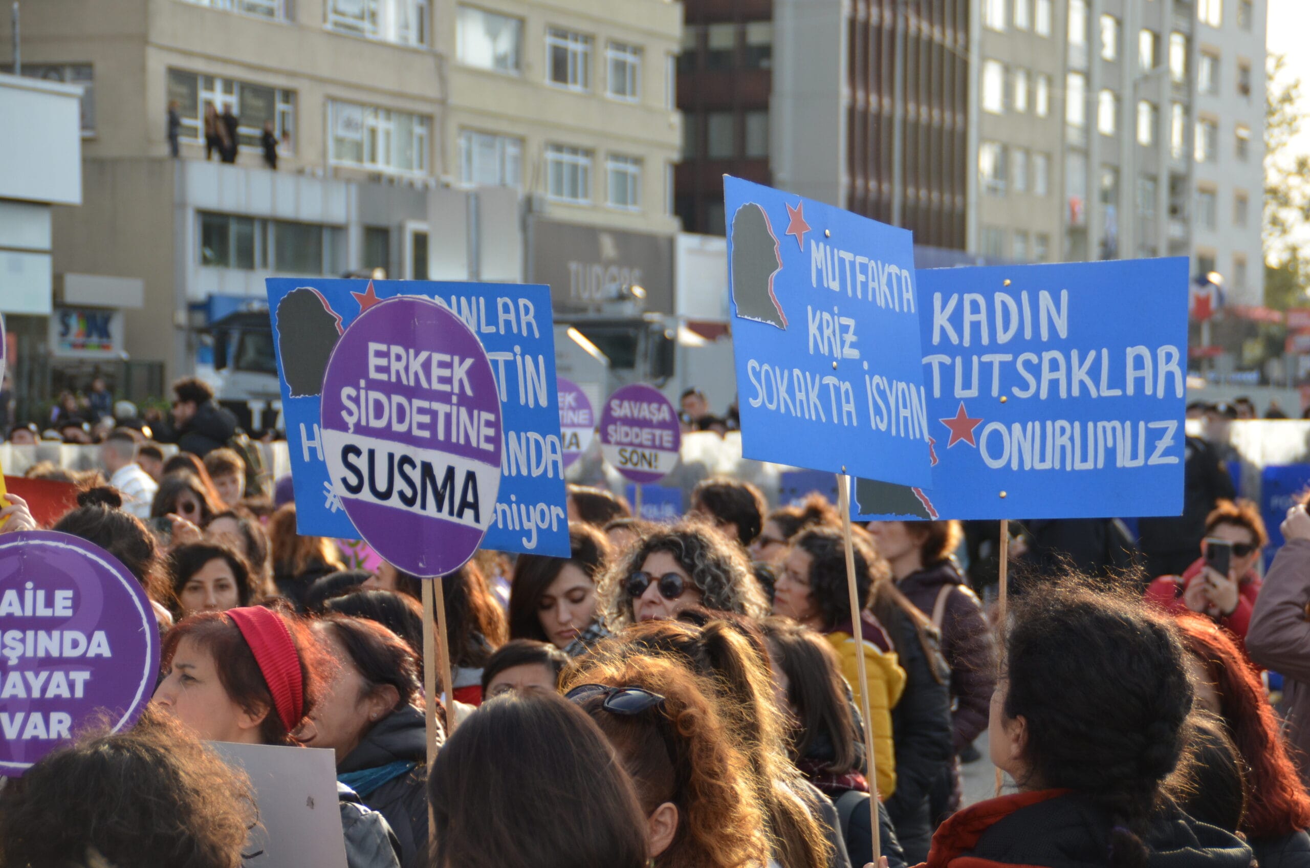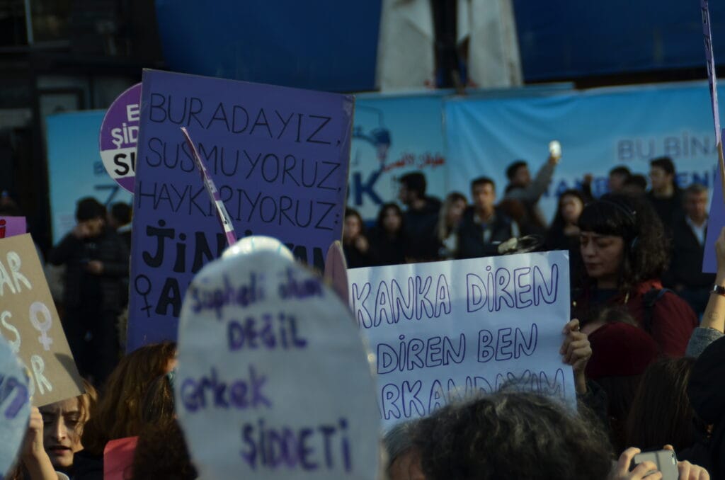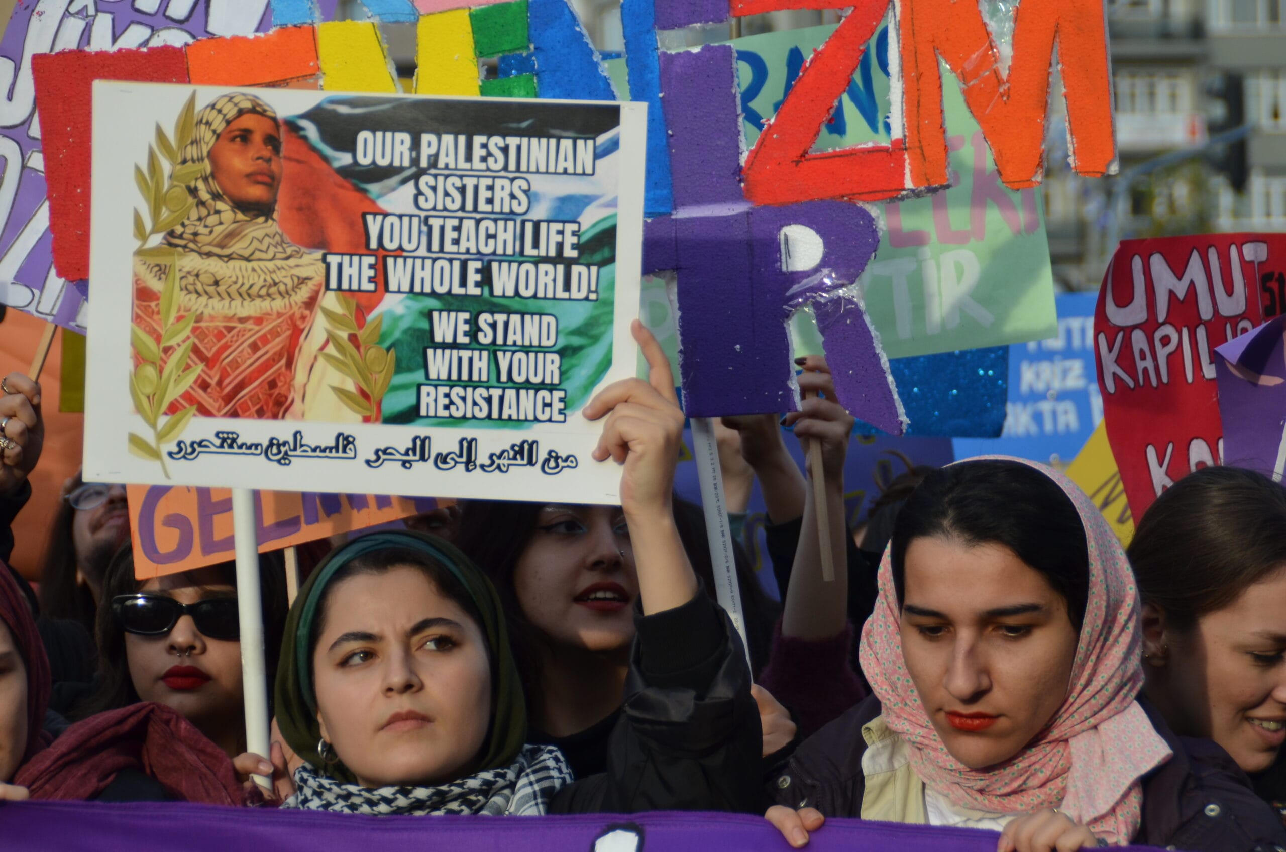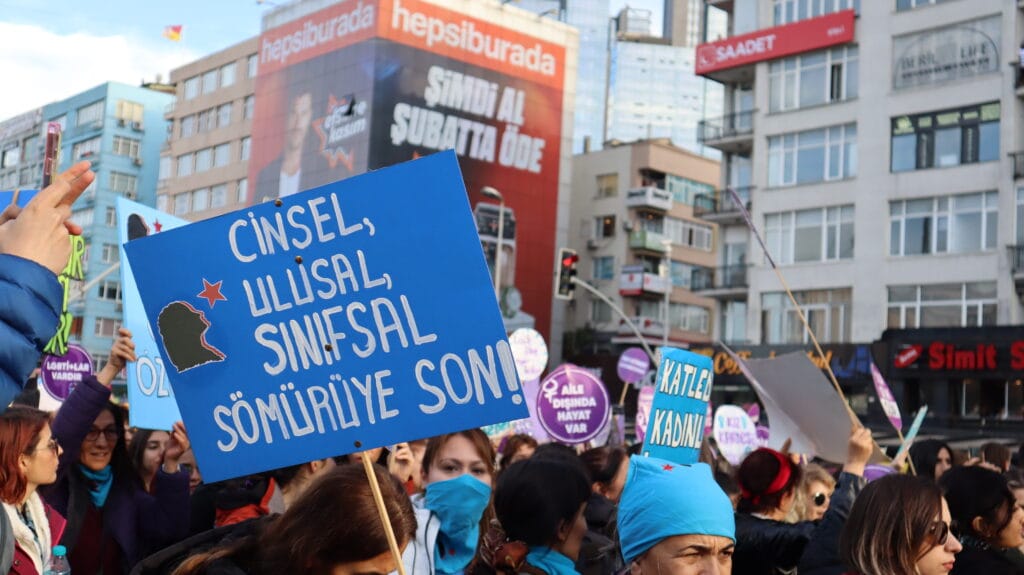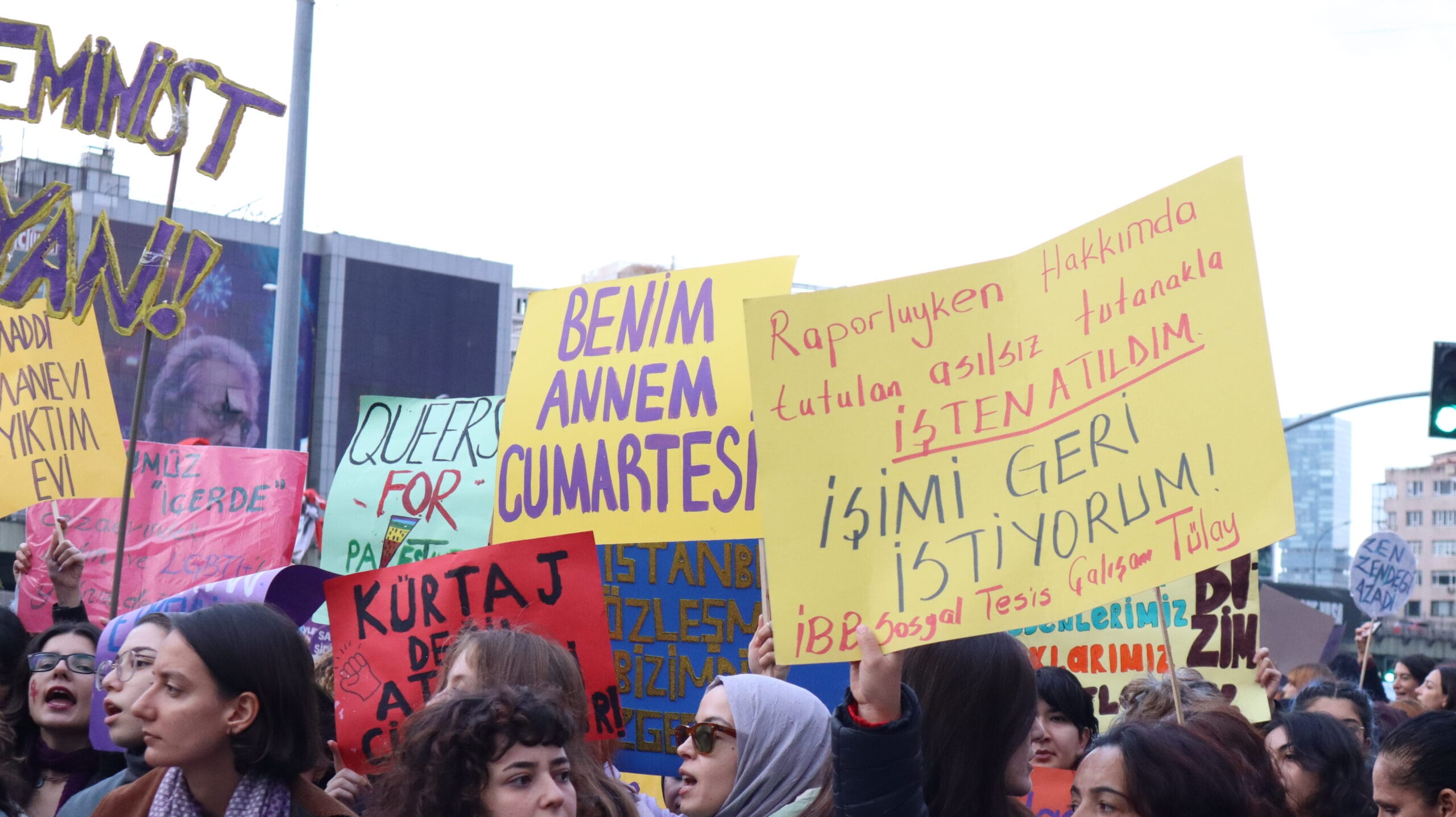 Mecidiyeköy’ün ara sokaklarından sloganlarla yürüyerek meydana gelen kadınların dövizlerinde Siyonist İsrail’in Filistin halkına dönük soykırım saldırıları, kadın cinayetleri, KYK yurdunda ihmal sonucu katledilen Zeren Ertaş, deprem katliamı, yoksulluk ve kadın sömürüsü, AKP-MHP iktidarının makbul kadın ve aile dayatması, LGBTİ+’lara dönük fobi, Rojava’ya yönelik işgal saldırıları ve cinsel, fiziksel, psikolojik erkek şiddeti ön plana çıktı.