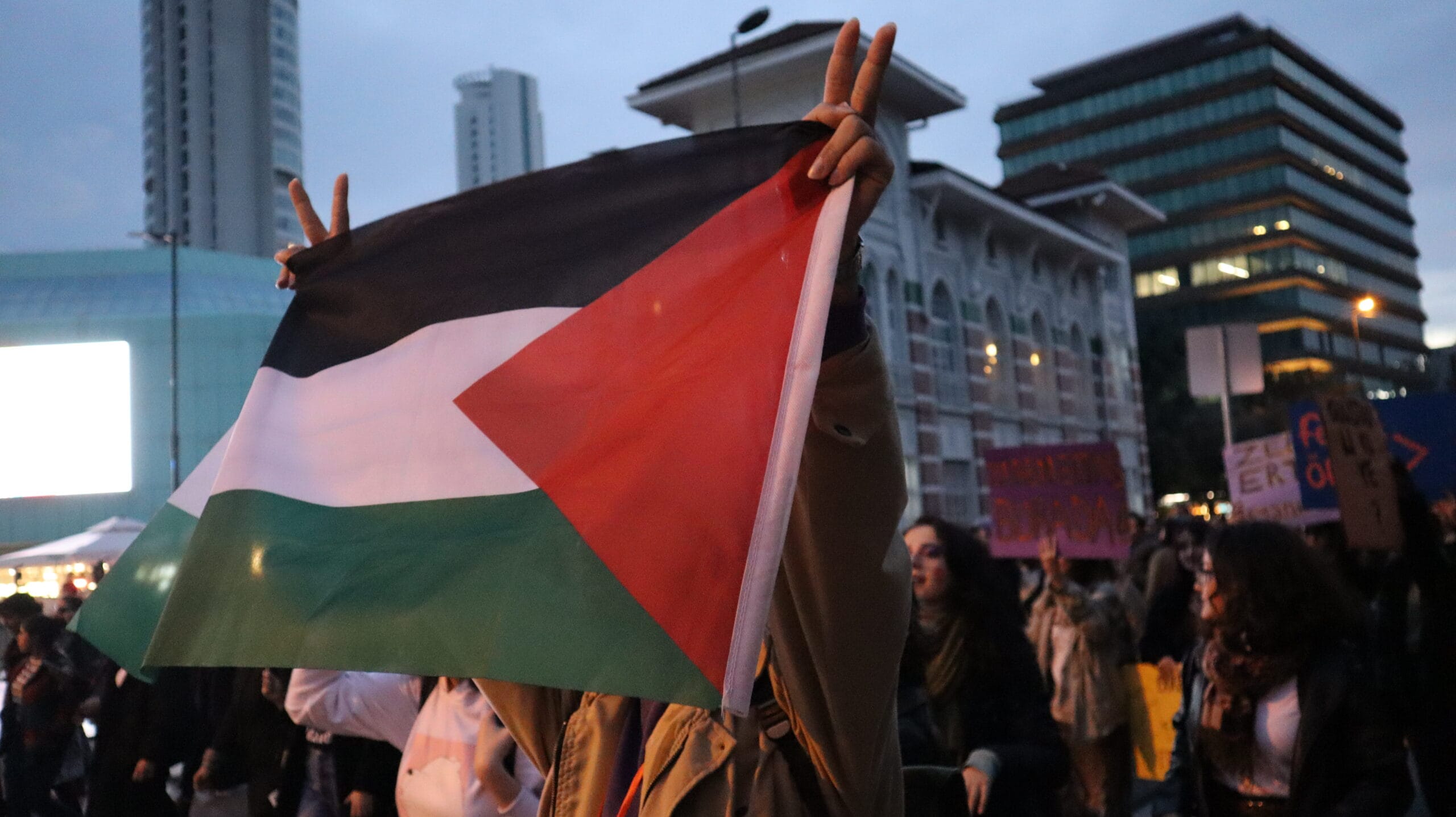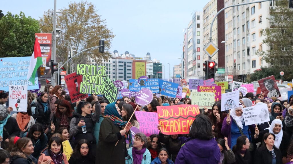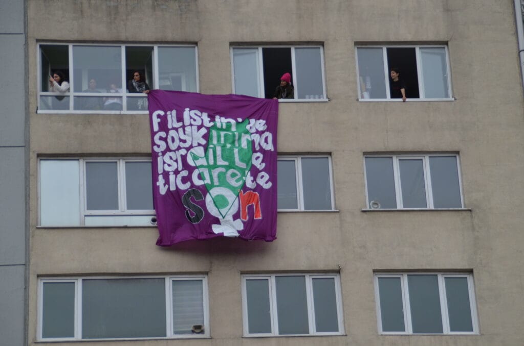 Büyükdere Caddesi’ndeki yürüyüş boyunca “Kadın Cinayetleri Politiktir”, “Tecavüzü Aklama, Suça Ortak Olma”, “Rojava’dan Gazze’ye Halklar Direnişte”, “Rojava’dan Filistin’e Direnen Kadınlara Bin Selam”, “Filistin’e Özgürlük, İsrail’e Boykot”, “Susmuyoruz, Korkmuyoruz, İtaat Etmiyoruz”, “Geceleri De, Sokakları Da, Meydanları Da Terk Etmiyoruz”, Kadınlar Sokağa Özgürleşmeye”, “Yaşasın Örgütlü Mücadelemiz”, “Trans Cinayetleri Politiktir” sloganları atan kadınlar, cadde üzerindeki bir binadan, “Filistin’de Soykırıma, İsrail’le Ticarete Son” pankartı sarkıttı.