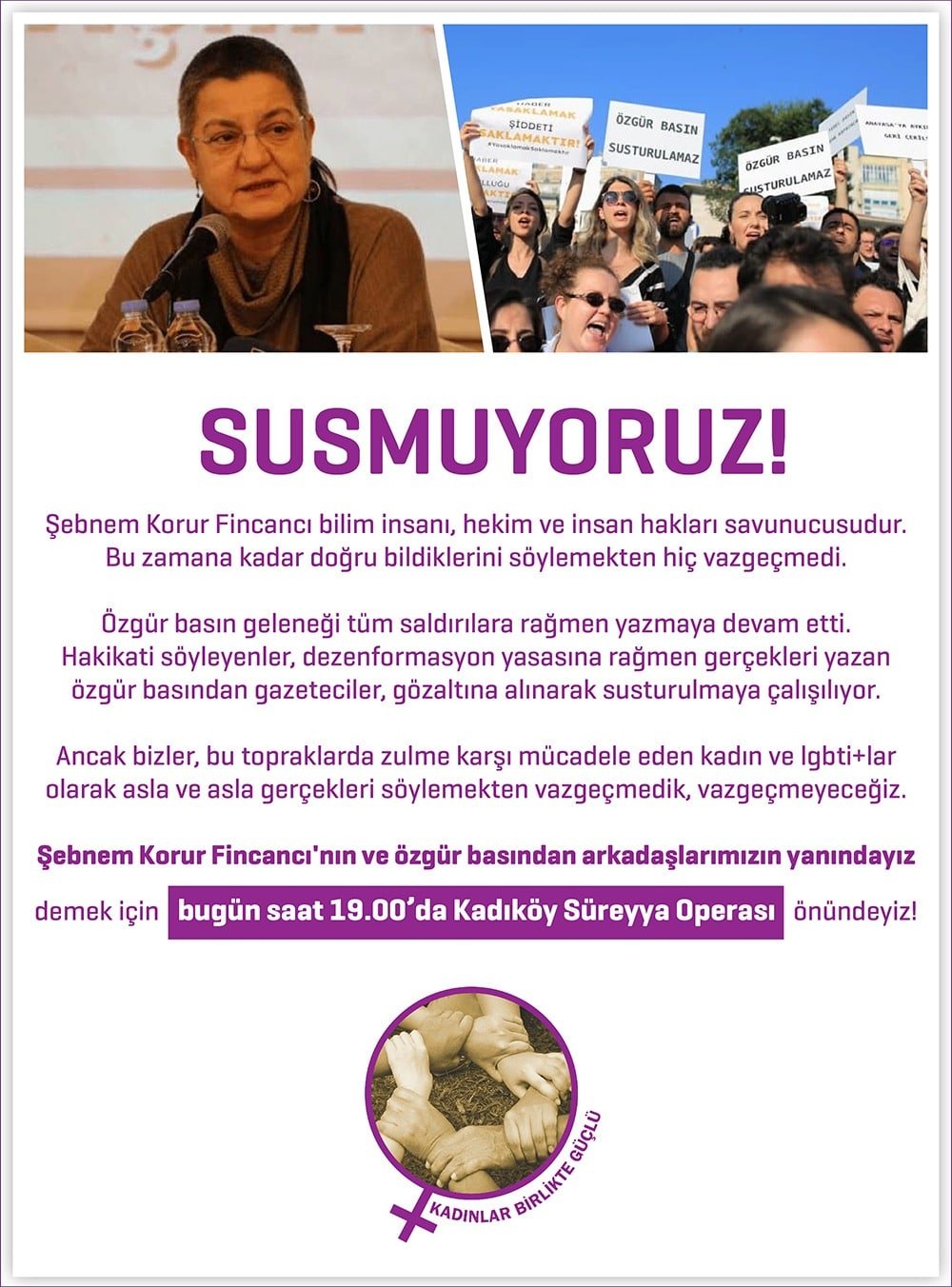 “Sosyal medya hesapları üzerinden 2911 Sayılı Toplantı ve Gösteri Yürüyüşleri Kanunu’na aykırı olarak “Şebnem KORUR FİNCANCI’nın ve Özgür Basından Arkadaşlarımızın Yanındayız. SUSMUYORUZ!” adı altında yasa dışı toplanma çağrıları yapıldığı tespit edilmiştir.