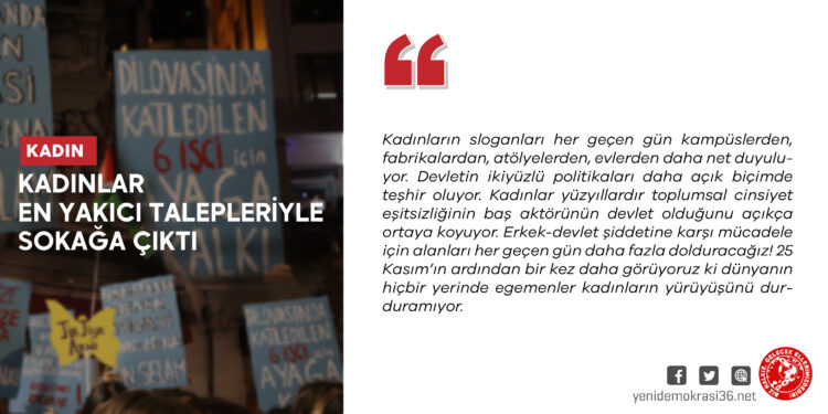 25 Kasım’dan günler önce Dilovası’nda bir parfüm deposunda önüne geçilmeyen ihmaller nedeniyle çıkan yangın sonucu altı kadın ve çocuk işçi katledildi. Aynı mahallede oturmasına rağmen katledilen işçi kadınlar ayrı saatlerde ve ayrı yerlerde toprağa verildi. Halkın öfkesini ve hesap sormasını engellemek isteyenler bir kez daha kadınların öfkesine yenildi. Çünkü 25 Kasım günü binlerce kadının çığlığı ile Dilovası’nda katledilen kadınların sesi tüm ülkede yankılandı. “Dilovası’nda Katledilen Kadınlar İsyanımızdır!”