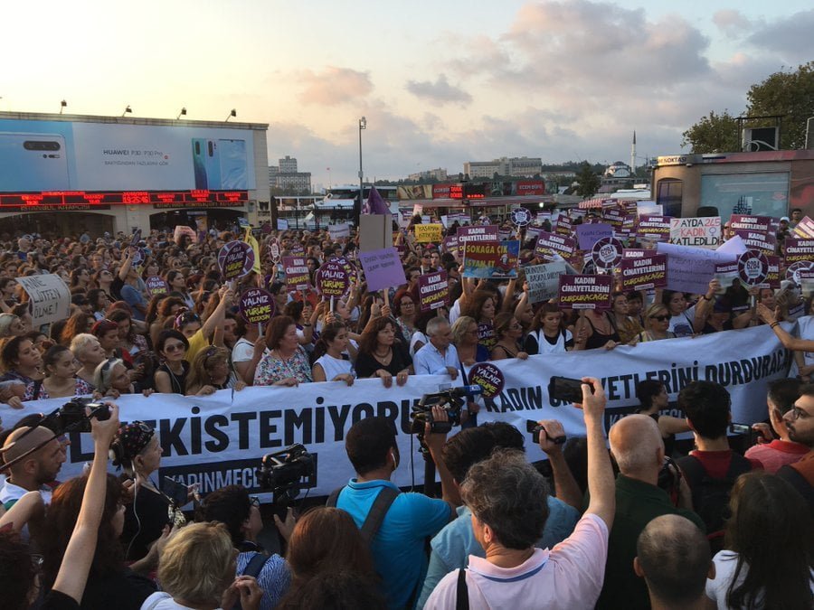 İstanbul Kadın Meclisleri’nin çağrısıyla İskele Meydanı’nda toplanan binlerce kadın “Kadın cinayetlerini durduracağız!”, “Ölmek istemiyoruz” pankartlarını taşıdı.