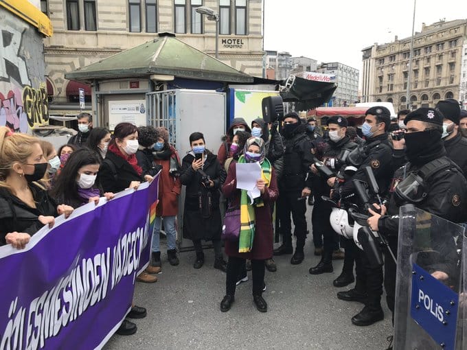 Barikatın açılmaması üzerine kadınlar oturma eylemi yaptı. KESK İstanbul Kadın Meclisi burada yaptığı açıklamada, İstanbul Sözleşmesi’nden, yaşamlarından ve kazanılmış haklarından vazgeçmeyeceklerini vurguladı.