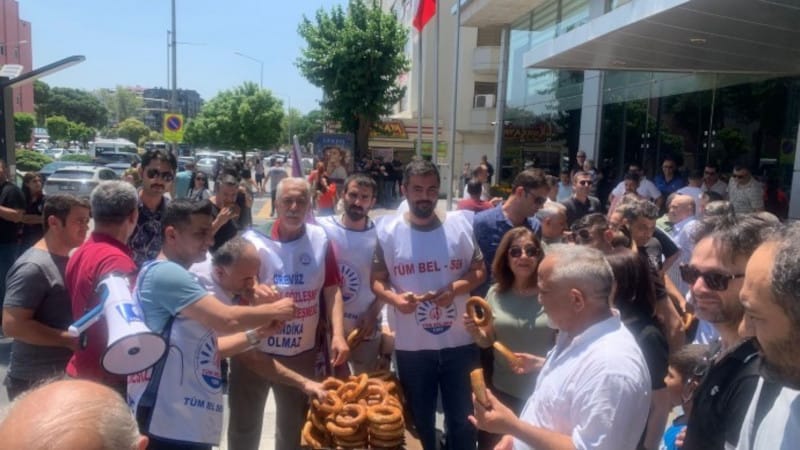 Uzun bir zamandır maaşlarını tam alamayan İzmir Karşıyaka Belediyesi işçileri, paralarının ancak simit almaya yettiğini belirterek simitle eylem yaptı. Tüm Bel-Sen İzmir 2 Nolu Şubesi üye işçiler adına konuşan iş yeri temsilcisi Fırat Belen, belediye emekçilerinin direnişine destek çağrısı yaptı.