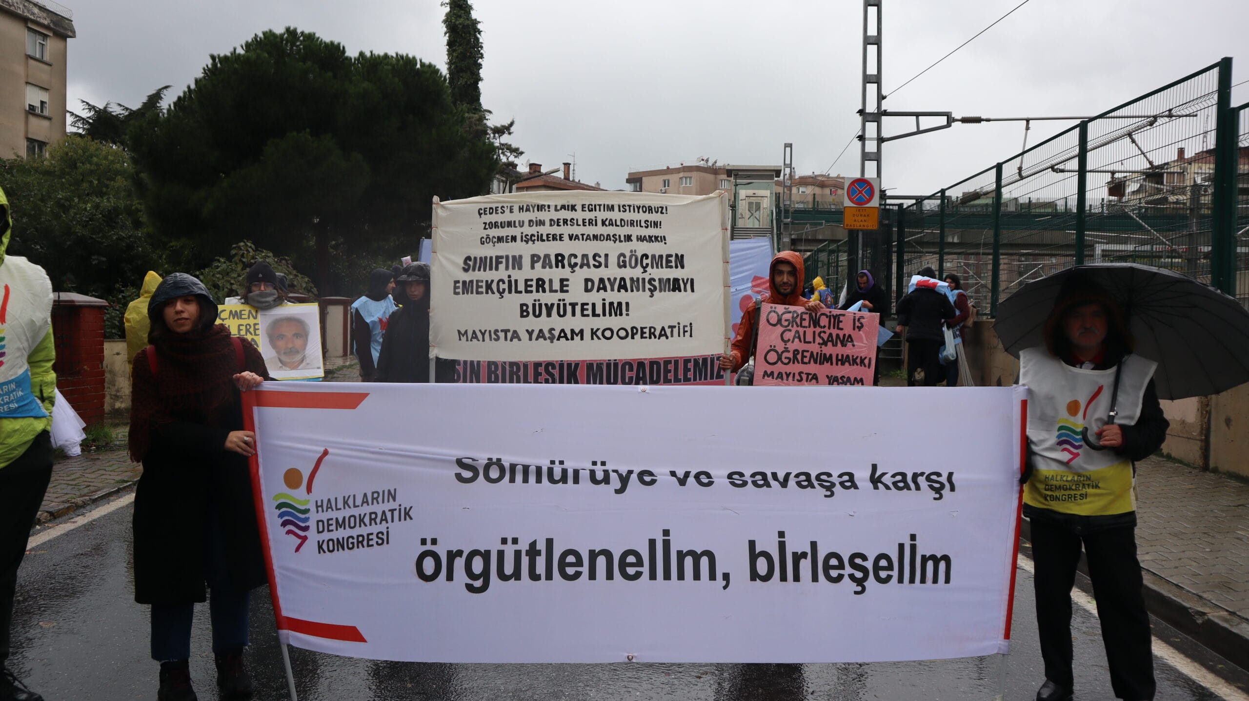 Miting alanına İşçi Emekçi Birliği’nin, “İşyerlerinde baskı, mobbing, tacize son vereceğiz!”, “Elektrik, su, doğalgaz, ulaşım, iletişim en temel insan hakkıdır. Ücretsiz olmalıdır!”, “Emekli maaşları yoksulluk seviyesinin üstüne çıkarılsın”, “Taşeron çalışma, işten atma yasaklansın. Herkese iş ve gelir güvencesi!”, “İşçi ve emekçilerden alınan dolaylı ve dolaysız tüm vergiler kaldırılsın!”, “Bizleri kurtaracak olan kendi kollarımızdır”, “Savaşa değil emekçiye bütçe”, “KHK’lar iptal edilsin”, “Eşit işe eşit ücret”, “Sendikal örgütlenme önündeki engeller kaldırılsın”, “Eğitim ve sağlık her düzeyde ücretsiz olmalıdır” taleplerinin yer aldığı pankartlar asıldı.
