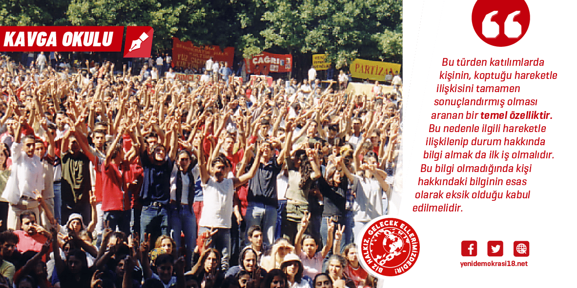 Katılımlarda kişilerin devrimci eylemlerinin önünü açmak, devrime katkısını sağlamak temeldir; bununla beraber bu yapılırken devrimci-demokrat hareketlerin ilişkilerine en ileri derecede değer vermek de temel bir yaklaşımdır. Bunun zayıf kaldığı yerde kişinin devrime katılımında da sorunların yaşanması olasıdır. Bu nedenle bu ikisi arasında doğrudan bir bağ olduğunu bilerek ve devrim için en uygun olanı geliştirmenin her ikisinde de başarı gerektirdiğini kavrayarak hareket etmeliyiz.