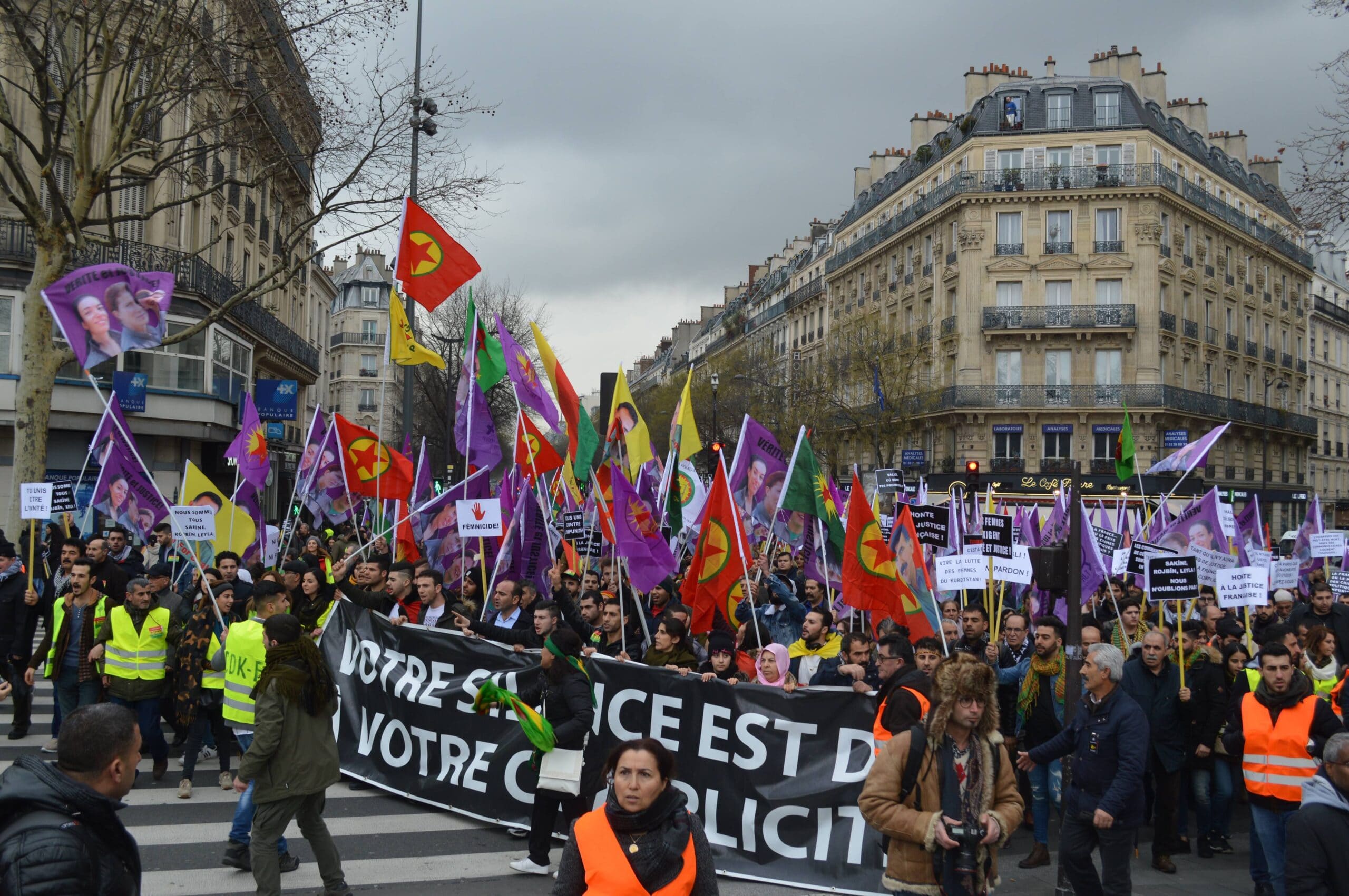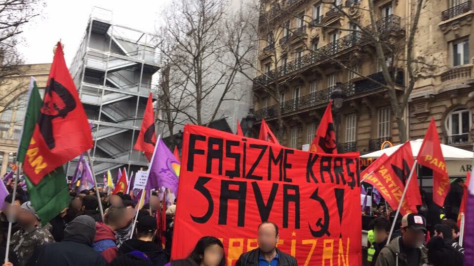 Gare de Nord önünde bir araya gelen yurtsever, göçmen devrimci örgütler ve Fransız kurumlar, Republique Meydanı’na yürüdü. Yürüyüşte PARTİZAN da yerini aldı. Partizan, Fransa Maoist Komünist Parti (Parti Communiste Maoïste-PCM), Marksist Leninist Komünist Örgüt-Proleter Yol (Organisation communiste marxiste-léniniste – Voie prolétarienne-OCML-VP) kurumları, flamalarıyla birlikte TKP/ML pankartı arkasında yürüyüşe katıldı. Yürüyüş boyunca “Jin, Jiyan, Azadi!”, “Şehit Namırın”, “Üçlerin Katili Faşist TC Devleti”, “Yaşasın Partimiz TKP/ML” gibi sloganlar ve Fransızca sloganlar atıldı.