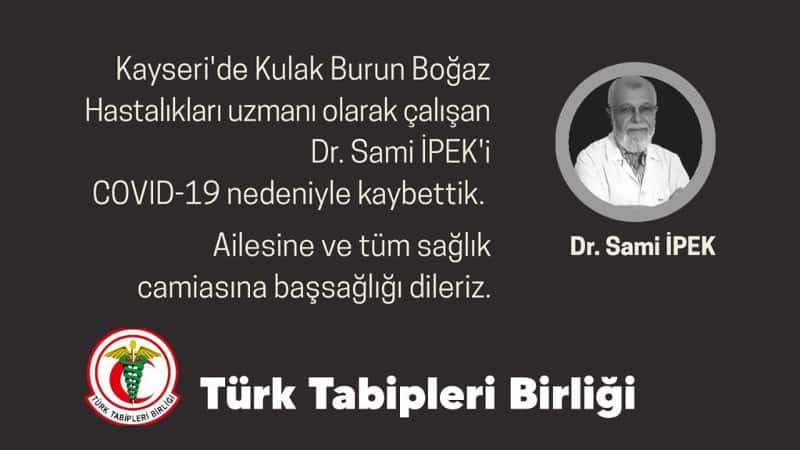 TTB’nin açıklamasında, “#Ölüyoruz Kayseri’de Kulak Burun Boğaz hastalıkları uzmanı olarak çalışan Dr. Sami İpek’i Covid-19 nedeniyle kaybettik. Ailesine ve tüm sağlık camiasına başsağlığı dileriz. #Yönetemiyorsunuz” denildi.
