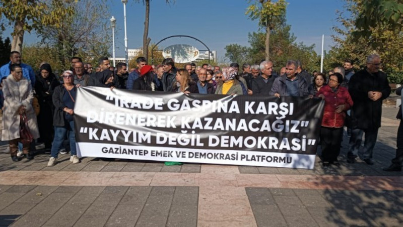 Antep Emek ve Demokrasi Platformu, kayyum darbesine karşı Yeşilsu Parkında yan yana geldi. “İrade gaspına karşı direnerek kazanacağız” pankartı açılan eylemde açıklamayı platform adına Sağlık ve Sosyal Hizmet Emekçileri Sendikası (SES) Antep Şube Eş Başkanı Serpil Dağdemir yaptı. Açıklama, “Direne direne kazanacağız” sloganı ve alkışlarla son buldu.