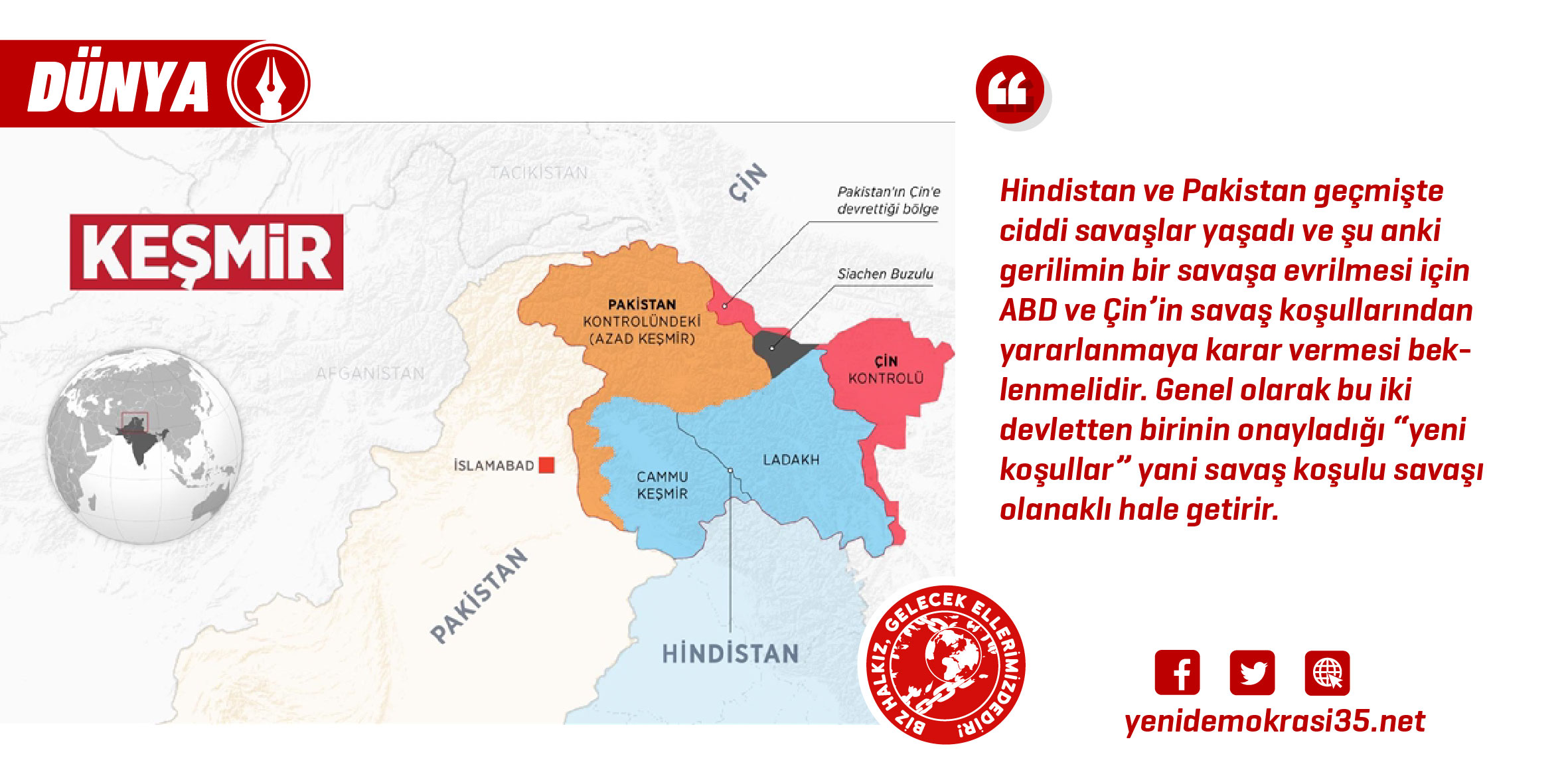Özetle, iki ülke arasındaki gerilim sadece o bölge arasında sınırlı kalmayacaktır. Bölgede konumlanan emperyalist güçler kendileri için denge sağlamaya çalışacaktır. Halihazırda ticaret savaşları devam ederken olası bir askerî gerilimin kendini dayatıp dayatmayacağı ise merak konusu. Ancak Hindistan ve Pakistan geçmişte ciddi savaşlar yaşadı ve şu anki gerilimin bir savaşa evrilmesi için ABD ve Çin’in savaş koşullarından yararlanmaya karar vermesi beklenmelidir. Genel olarak bu iki devletten birinin onayladığı “yeni koşullar” yani savaş koşulu savaşı olanaklı hale getirir. Oysa “ticaret savaşı” olayında gördük ki emperyalistler henüz dünya savaşına yol verecek düzeyde saldırgan davranmamaktadırlar. Bu nedenle halihazırda çatışmalar devam ediyor olsa da dünya savaşına yol açacak denli bir bölgesel savaş mümkün değil gibi gözüküyor. Çünkü iki ülkenin gerilimi artırması ABD ve Çin’i karşı karşıya getirecektir. Her halükârda bundan olumsuz etkilenen ise bölgede yaşayan halklar olacaktır.