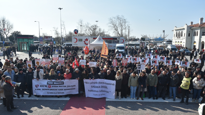 İş Gıda’nın konkordato başvurusuyla işsiz kalan KFC ve Pizza Hut işçileri, Kadıköy Rıhtım’da büyük buluşma düzenledi. “Biz Çalıştık İlkem Kazandı”, “KFC Ve Pizza Hut’da Çalışan 6 Bin İşçinin Emeğini Gasp Edemezsin” ve “Sadaka Değil Hakkımızı İstiyoruz” pankartlarının açıldığı eylemde, “İşçilere Hakkını Ver”, “Bu Menüde Direniş Var”, “Konkordato Sermayeyi Koruyor Öncelik İşçiye”, “Pizza Hut ve KFC İşçisi Yalnız Değildir” dövizleri taşındı.