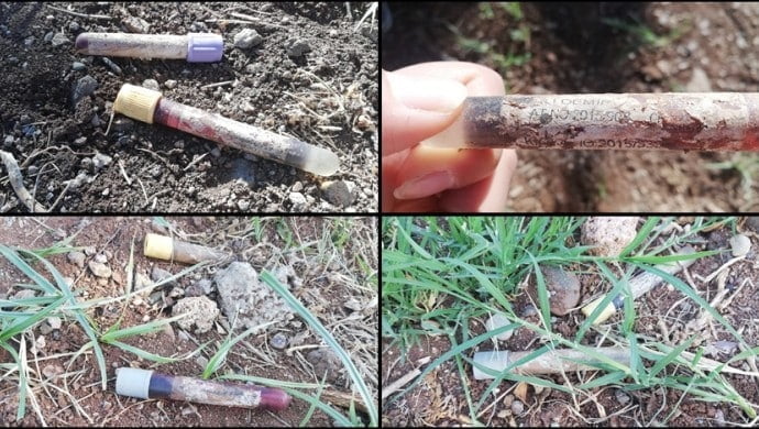 Diyarbakır’ın Bağlar ilçesine bağlı Yeniköy Mezarlığı’nda bulunan “kimsesizler” bölümünde toprağa gömülen dolu kan tüpleri ortaya çıktı. Jinnews’te yer alan habere göre, olay bayram dolayısıyla mezarlık ziyaretine gidenlerin görmesiyle öğrenildi. Kan tüplerinden birinin üzerinde Ali Demir isminin yazılı olduğu görüldü.