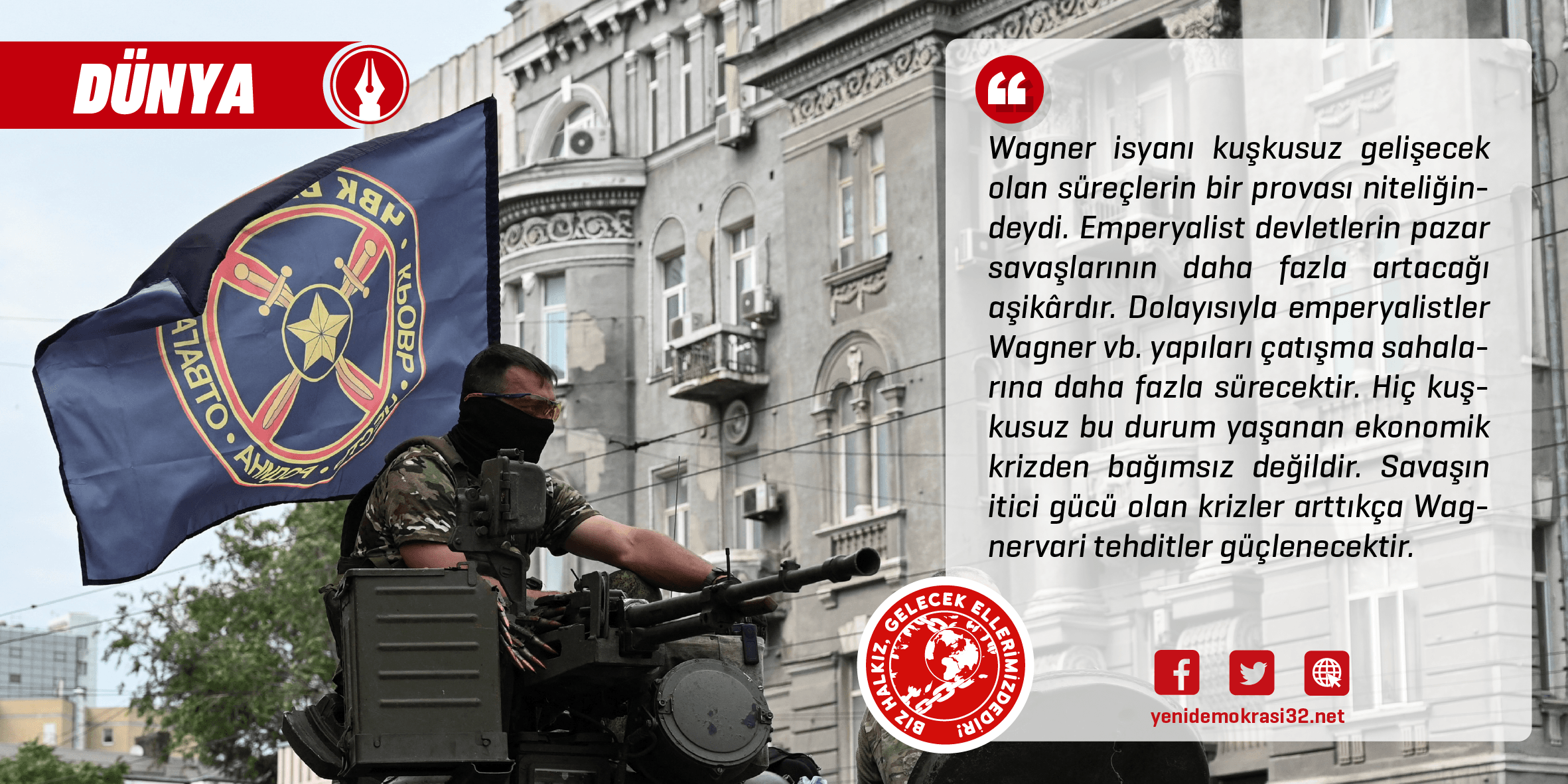 Wagner isyanı kuşkusuz gelişecek olan süreçlerin bir provası niteliğindeydi. Emperyalist devletlerin pazar savaşlarının daha fazla artacağı aşikârdır. Dolayısıyla emperyalistler Wagner vb. yapıları çatışma sahalarına daha fazla sürecektir. Hiç kuşkusuz bu durum yaşanan ekonomik krizden bağımsız değildir. Savaşın itici gücü olan krizler arttıkça Wagnervari tehditler güçlenecektir. “Emperyalizm savaşmak isteyince hiçbir anlaşma göz önünde bulundurulmayacaktır.” Mao yoldaşın bu sözünden yola çıkarak şunu diyebiliriz: Emperyalistler her daim kendi savaşlarının propagandasını yapar. Bugün emperyalistlerin savaş istemi ihtilaflı alanlarda daha fazla hissediliyor. Suriye’de, Ukrayna’da, Afrika ülkelerinde… Politikalar sertleşirken askeri güçlere yatırım artıyor. Savunma sanayi harcamaları her yıl daha fazla artıyor. Ülke ekonomileri de kaçınılmaz olarak yıkıma sürükleniyor. Daha fazla askeri harcama gücün temsili oluyor. Kitlelere askeri gücün varlığı propaganda edilerek güven inşa ediliyor. Bu güven inşası sürdürülebilir midir? Kuşkusuz sürdürülemezdir. Yoksulluğun artışı bu güven inşasını hırpalayacaktır. Sadece bu da değil. Kriz tüm ülkelerde görünür durumdayken krizi yönetme çabası içindeki devletler baskıcı politikalara dümen kırmakta, ilk elden kazanılmış haklara