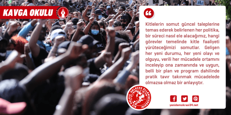 Kitlelerin somut güncel taleplerine temas ederek belirlenen her politika, bir süreci nasıl ele alacağımız, hangi görevler temelinde kitle faaliyeti yürüteceğimizi somutlar. Gelişen her yeni durumu, her yeni olayı ve olguyu, verili her mücadele ortamını inceleyip ona zamanında ve uygun, belli bir plan ve program dahilinde pratik tavır takınmak mücadelede olmazsa olmaz bir anlayıştır. Aksi durumda sürekli süreçten ve kitle pratiğinden koparak kitlenin ve kitle hareketlerinin gerisinde kalırız. Amacımız sadece çelişkilerinden yola çıkarak politika belirlemek değil, çelişkileri çözümlemek ve bu çelişkileri örgütlenmenin bir aracı haline getirmek için harekete geçmektir. İşçi sınıfı ve yoksul köylülük başta olmak üzere ezilen, sömürülen halk kitlelerinin devrime kazanılması, başka bir deyişle devrimci mücadelede yerini alabilmesi için nesnel şartlar olarak ifade ettiğimiz ekonomik ve siyasal koşulların elverişli olması tek başına yetmemektedir. Bu durumun nedenlerini ve çıkış yollarını ikna edici bir biçimde anlatmalı ve bunun kendi mücadele pratikleri içerisinde sınama süreçlerine öncülük etmemiz gerekmektedir.