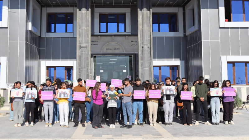 Kobanê Üniversitesi Öğrenci Konseyi, bir yıl önce Van’da katledilen Rojin Kabaiş için üniversite binası önünde yan yana geldi. Rojin Kabaiş’in fotoğrafları taşınan eylemde, “Hepimiz Rojin’iz” yazılı pankartlar açıldı.