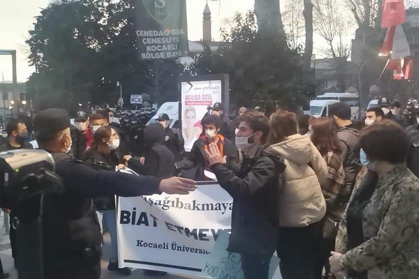 Boğaziçi Üniversitesi’ne atanan kayyum rektör Melih Bulu’yu protesto eden ve “#AşağıBakmayacağız, biat etmeyeceğiz” diyerek basın açıklaması yapmak isteyen Kocaeli Üniversitesi Dayanışması’nın eylemine polis engel oldu, 17 kişi gözaltına alındı.