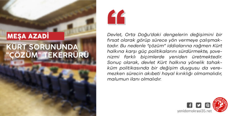 Devlet, Orta Doğu’daki dengelerin değişimini bir fırsat olarak görüp sürece yön vermeye çalışmaktadır. Bu nedenle “çözüm” iddialarına rağmen Kürt halkına karşı güç politikalarını sürdürmekte, şovenizmi farklı biçimlerde yeniden üretmektedir. Sonuç olarak, devlet Kürt halkına yönelik tahakküm politikasında bir değişim duygusu da veremezken sürecin akıbeti hayal kırıklığı olmamalıdır, malumun ilanı olmalıdır. Hazırlığımız bu yönde olmalıdır.