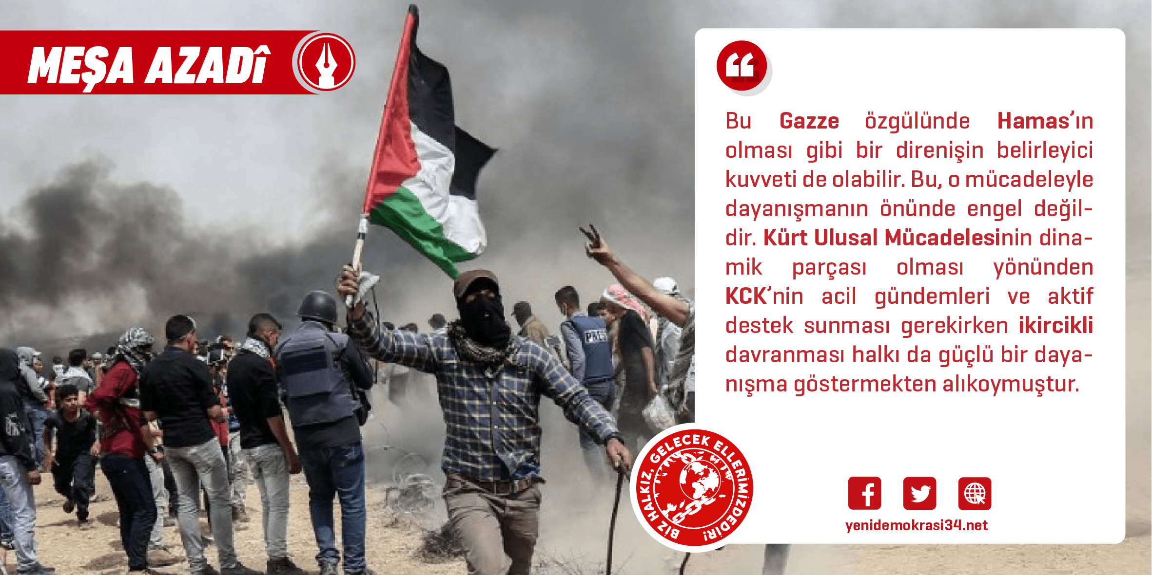 Filistin özgülünde de İsrail’in sürekli bir biçimde zulüm uyguladığı, savaşla kendini var ettiği koşullarda ezilen ulusa silah bırakma ve barış çağrısı yapmak temelde ezileni silahsız bırakmak anlamı taşır. KCK’nin barış çağrısı da “iki taraf” ele alışı da en başta Filistinlileri silahsızlandırmak anlamı taşıdığı için sorunludur. Kürt Ulusal Mücadelesinin meşru zemindeki eylemlerini “terör” olarak değerlendiren liberal, reformist güçlerin “barış” çağrısı ne denli anlamsız ve ezilenin silahsızlandırılması hedefini taşıyorsa Aksa Tufanı direnişinden hareketle Filistin Ulusal Mücadelesine “barışmanız gerekiyor” demek benzer amaca hizmet eder ki bu da en başta Kürt Ulusal Mücadelesinin karşısında durması gereken bir söylemdir. Filistin direnişinin geldiği aşama, elde ettiği kazanımlar ve askeri başarıları yeni olanaklar anlamı taşıyorken “barış” vurgusunun yerini meşru mücadelenin devam ettirilmesi almalıdır. Bu anlayışı içeren en ileri düzeyde dayanışma ezilen ulusların temel görevleri arasındadır. Vietnam direnişinin Filistin’e, Filistin’in de dört parçadaki Kürdistan’da süren mücadeleye katkısında da bu dayanışmanın özü vardır.