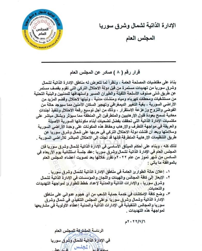 “Bu bağlamda, Kuzey ve Doğu Suriye Özerk Yönetimi’nin temel ilkeleri çerçevesinde, Kuzey ve Doğu Suriye Özerk Yönetimi Genel Meclisi 6 Temmuz 2022’de olağanüstü bir oturum düzenledi. Genel Meclis üyelerinin onayından sonra bu karar alındı.”