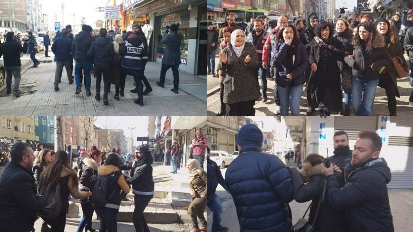 Kadınların etrafını çevreleyen polisler, kadınları darp ederek eylemlerine saldırdı. Roza Kadın Derneği Başkanı Adalet Kaya, Dicle Amed Kadın Platformu Dönem Sözcüsü Bahar Karakaş Ulu’yu yerlerde sürükleyerek darp eden polisler, HDP’li vekil Remziye Tosun’a da hakaretler ederek darp etti.