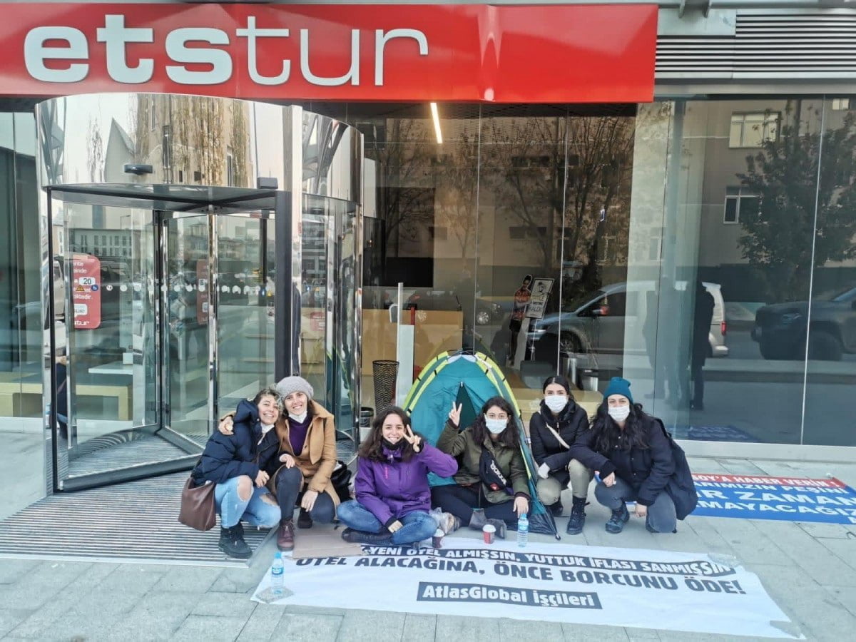 Kültür ve Turizm Bakanı Mehmet Nuri Ersoy’un kardeşi Ali Murat Ersoy’un sahibi olduğu havacılık şirketi AtlasGlobal çalışanları, Bakan Ersoy’un sahibi olduğu Etstur önünde eylem başlattı.