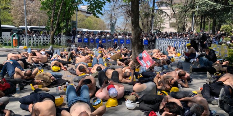Yıllardır ödenmeyen hakları için Ankara’ya yürüyen Doruk Madencilik işçileri, direnişlerinin 13’ünci, açlık grevlerinin 5’inci gününde Kurtuluş Parkı’ndaki nöbet alanında mücadelesini sürdürüyor. İşçiler bugün sendikaları Bağımsız Maden-İş öncülüğünde Enerji ve Tabii Kaynaklar Bakanlığı’na yürümek istedi. Polis tarafından ablukaya alınan madenciler yürümekte ısrarcı olunca polis biber gazıyla saldırdı. 6 madenci fenalaştı, 3’ü hastaneye kaldırıldı.
