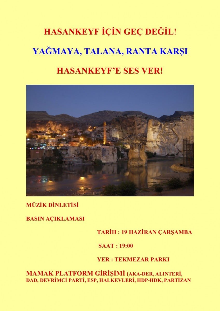 Devrimci demokrat kurumların oluşturduğu Mamak Platform Girişimi (Partizan, AKA-DER, Alınteri, DAD, Devrimci Parti, Halkevleri, ESP, HDP-HDK)’nin “Hasankeyf için geç değil! Yağmaya, talana, ranta karşı Hasankeyf’e ses ver!” sloganıyla düzenlediği etkinlik 19 Haziran günü, saat 19’da Tekmezar Parkında gerçekleştirilecek.