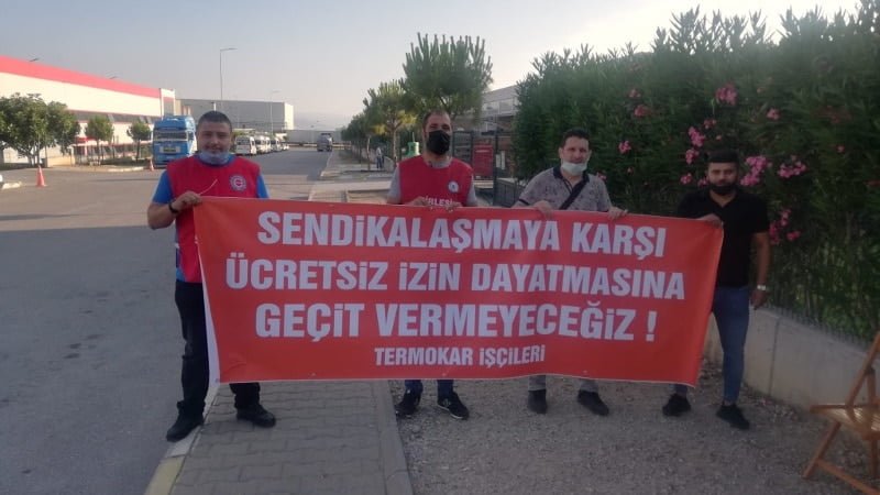 Termokar fabrikasında 2018 yılında başlayan sendikal mücadele devam ediyor. Birleşik Metal-İş Sendikası’nın örgütlendiği fabrikada, sendika Çalışma Bakanlığı’nda çoğunluk belgesi alsa da işveren itirazı sonucu devam eden davalar nedeniyle sendika hâlâ yetki sahibi olamadı. Salgını fırsat bilen patron ise sendikalı işçileri ücretsiz izine çıkardı. 40’a yakın işçi işe iade için direniş başlattı. İşçilerin büyük çoğunluğu işe geri döndü ancak 6 işçi hâlâ ücretsiz izinde. İşçiler dün fabrika önünde direniş çadırı kurdu.
