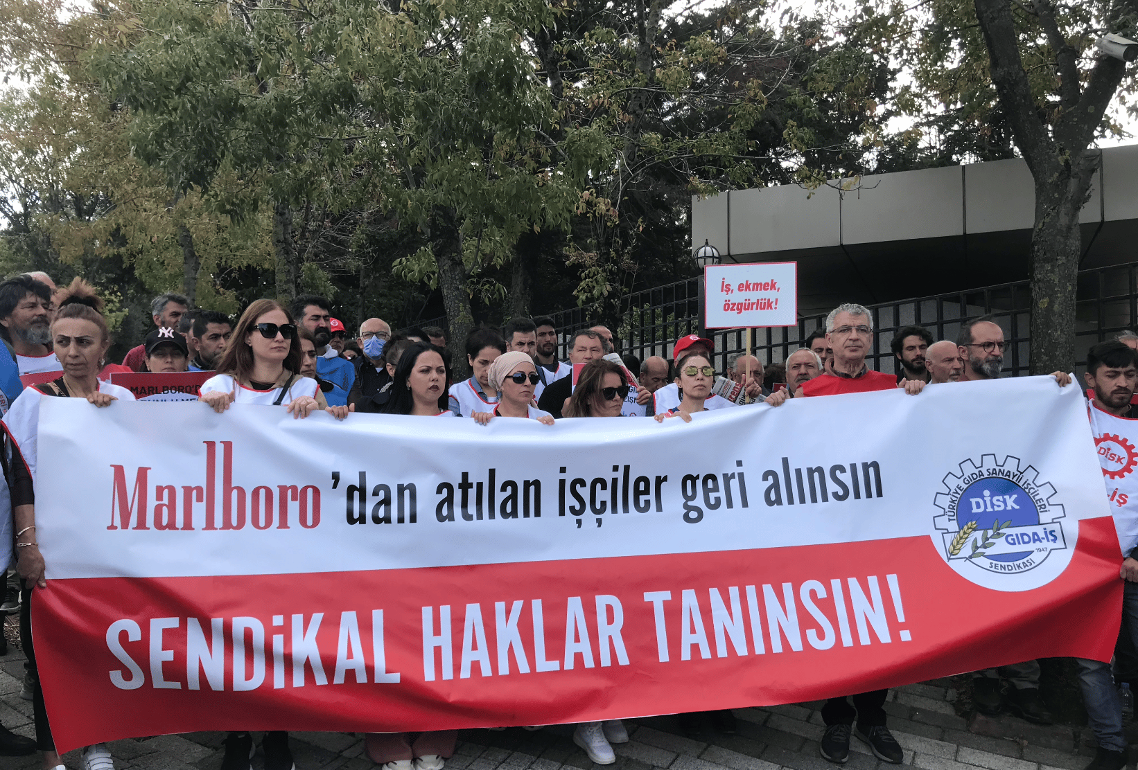 Düzenlenen eylemde basın açıklamasını işçilerin örgütlü olduğu Gıda-İş Sendikası Genel Başkanı Seyit Aslan okudu. Philip Morris (Marlboro) patronunun işçilerin örgütlenme hakkına yönelik saldırısını kınadığını söyleyerek sözlerine başlayan Aslan, “Örgütlenme çalışmasını kırmak ve engellemek için onlarca arkadaşımız sürgün edilmeye çalışıldı, kabul etmedik. Marlboro işvereninin baskıları sürgünle sınırlı kalmadı, şu ana kadar 120’yi aşkın işçi arkadaşımız keyfi ve hukuksuz biçimde işten atıldı, atılmaya devam ediliyor” dedi. Philip Morris (Marlboro) yönetiminin yasa ve anayasaya uymadığından bahseden Aslan, “Onlarca yılını Marlboro Sigara Fabrikasına vermiş alan işçiler, işten atıldıktan sonra insanlık dışı davranışlarla karşı karşıya kaldılar. Fabrika içinde tuvaletlere girmeleri engellendi, su dahi verilmedi. Fabrika dışında bekleyen işçi arkadaşlarımızın getirdiği ekmek ve sulara fabrika içindeki işçilere ulaşmasını engellediler” diye anlattı.