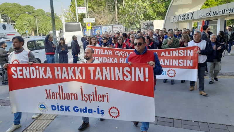 İşçiler, İzmir’in Konak ilçesinde Möntro Meydanından Basmane’de bulunan Marlboro ofisine yürüdü. “Atılan işçiler geri alınsın, sendika hakkımız tanınsın” pankartı açılan eyleme, çok sayıda siyasi parti ve demokratik kitle örgütü temsilcisi destek verdi.