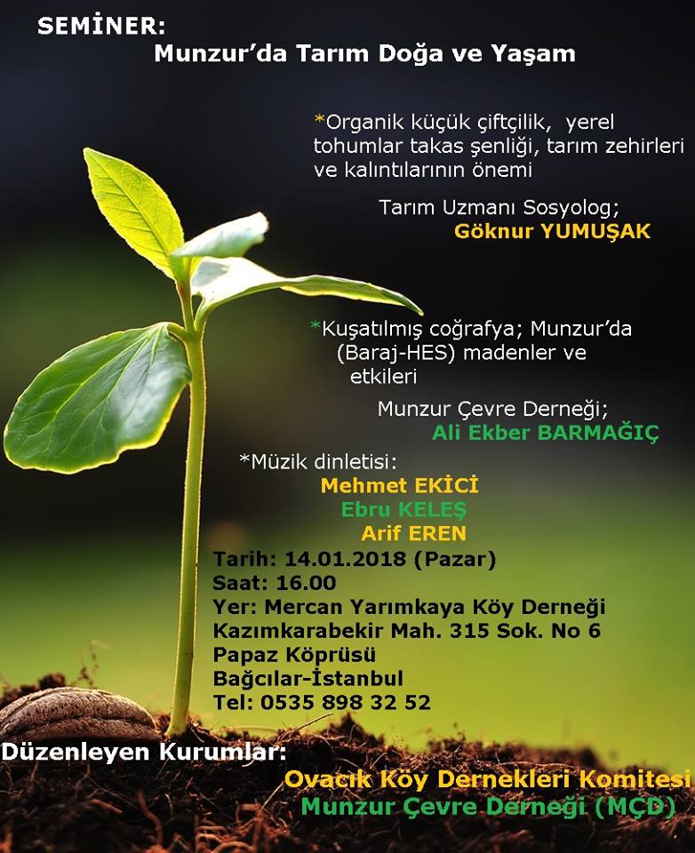 HABER MERKEZİ- Dersim’de yok olmaya yüz tutmuş tarım ve yaşam alanlarına ilişkin, Ovacık Köy Dernekleri Komitesi ve Munzur Çevre Derneği önümüzde ki yaz sürecini tartışarak ortak bir çözüm üreteceği bir seminer düzenliyor.