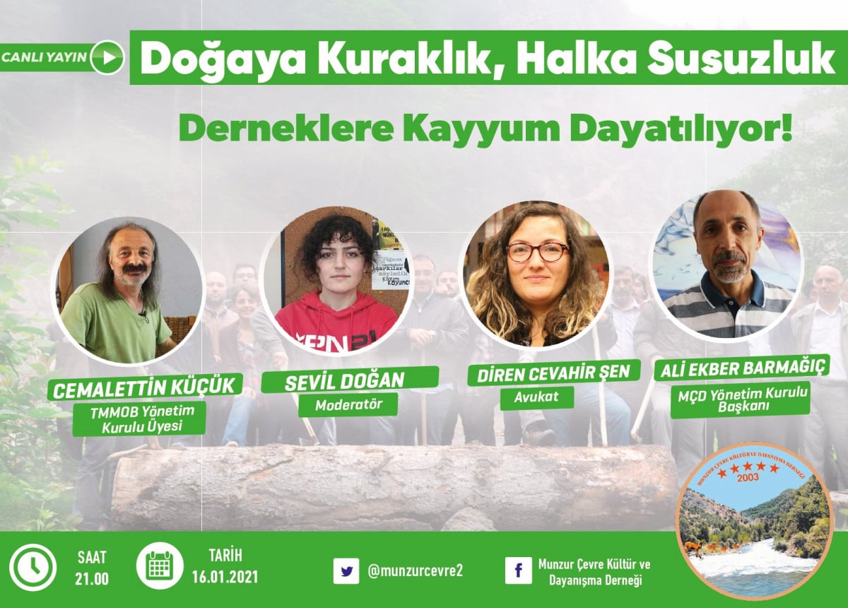HABER MERKEZİ- Munzur Çevre Derneği, son dönemde çokça gündeme gelen kuraklık sorunu ve çevre derneklerini de özellikle hedefleyen kayyum saldırısının tartışılacağı bir e-panel düzenliyor. Sevil Doğan’ın yöneteceği panelde, TMMOB Yönetim Kurulu Üyesi Cemalettin Küçük, Avukat Diren Cevahir Şen ve MÇD Yönetim Kurulu Başkanı Ali Ekber Barmağıç ise konuşmacı olarak yer alıyor. Panel bugün (16 Ocak) saat 21.00’da Munzur Çevre Derneği’nin sosyal medya hesapları üzerinden yayınlanacak.