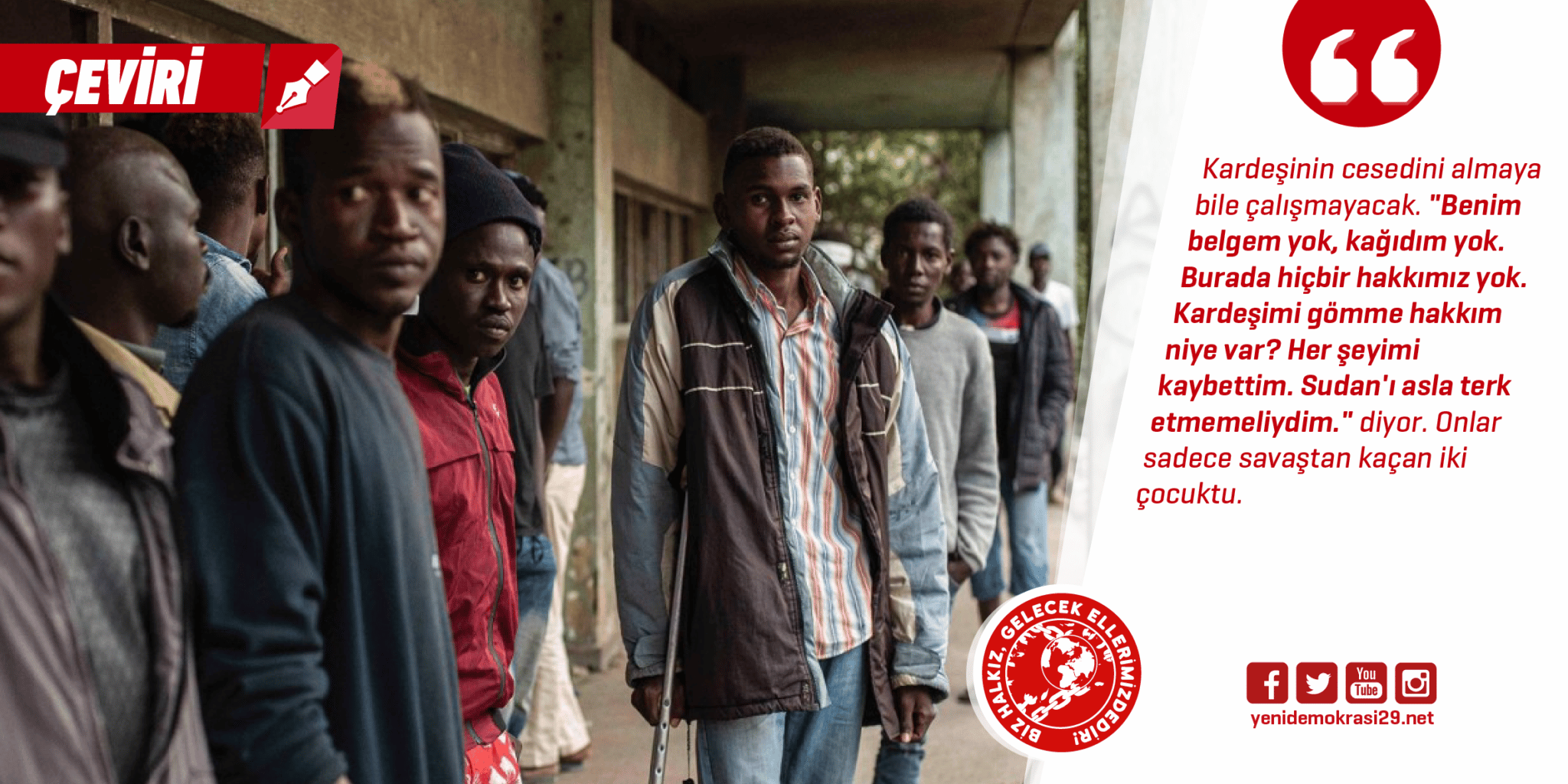 Mohamed Abdelbsad onları bir arkadaşıyla el ele izliyor. “Her şey için pişmanım. Tekrar deneyebilir miyim bilmiyorum. Burada bulunanların çoğu bunu yapacak, ama ben çok büyük bir bedel ödedim.” diye itiraf ediyor. “Benim için Avrupa artık eskisi gibi olmayacak. Eğer geçersem onu çok üzeceğim.” diye ekliyor. Kardeşinin cesedini almaya bile çalışmayacak. “Benim belgem yok, kağıdım yok. Burada hiçbir hakkımız yok. Kardeşimi gömme hakkım niye var?”. “Her şeyimi kaybettim. Sudan’ı asla terk etmemeliydim” diyor. Onlar sadece savaştan kaçan iki çocuktu.