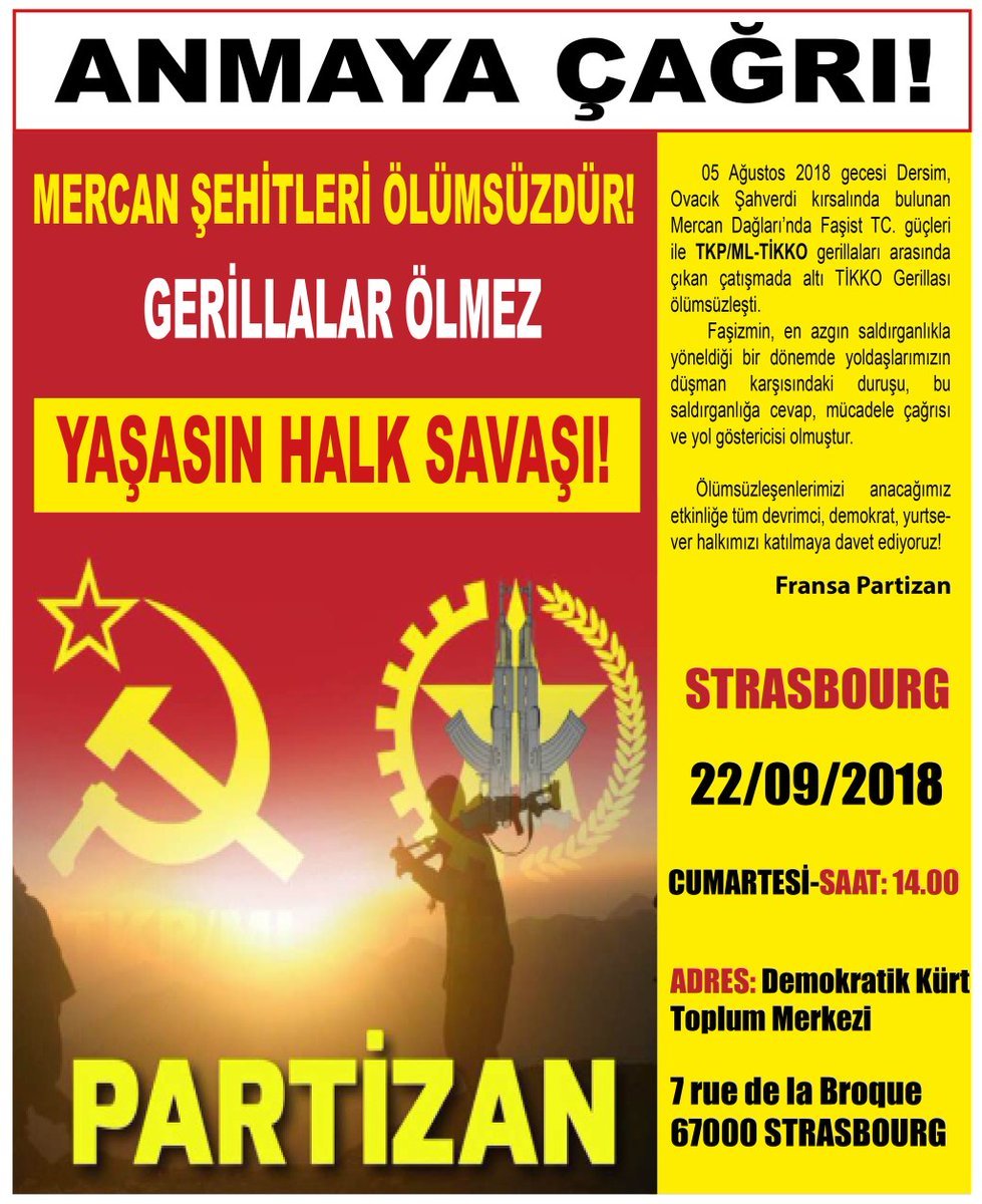 HABER MERKEZİ- 5-6 Ağustos tarihlerinde Dersim-Mercan yaylalarında, faşist ordu güçleriyle girilen çatışmada şehit düşen altı TKP/ML-TİKKO gerillası Fransa’nın Strasbourg şehrinde anılacak.