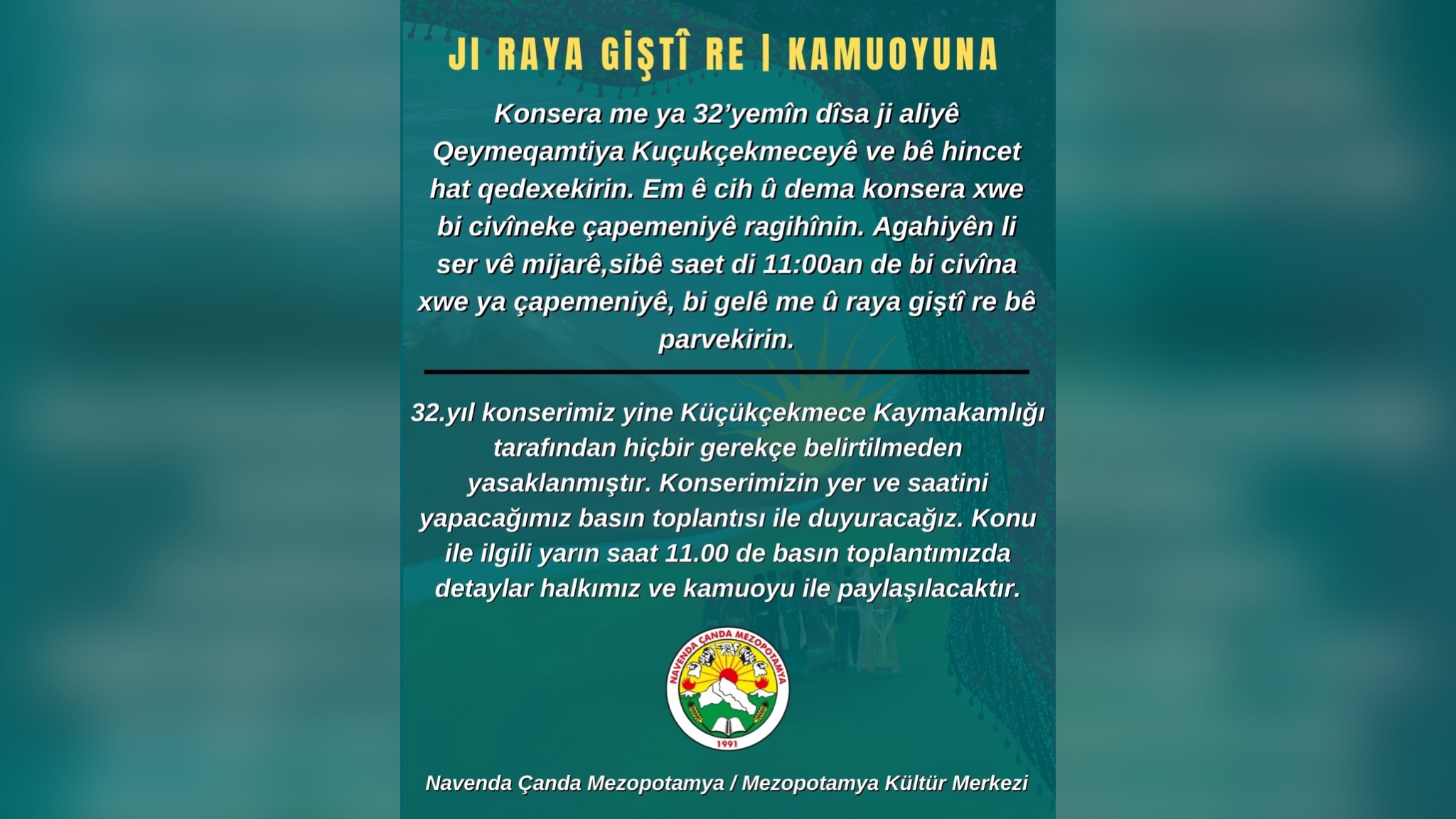 Mezopotamya Kültür Merkezi’nin (MKM) 32. yıl etkinliği Küçükçekmece Kaymakamlığı tarafından yasaklandı.