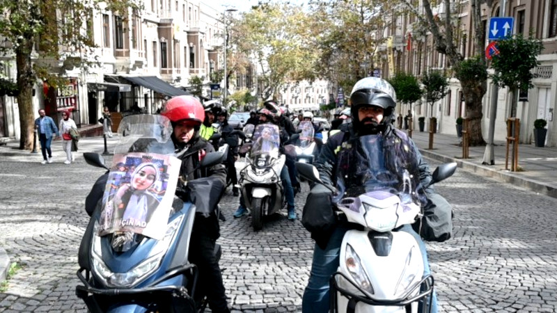 Motorlarıyla Beşiktaş’tan Beyoğlu’nda bulunan Hacıahmet Parkına kadar konvoy olan motokuryeler, Rojin Kabaiş’in fotoğraflarının yer aldığı “Rojin İçin Adalet” şiarlı dövizleri taşıdı.
