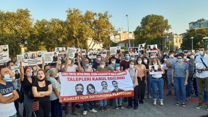 Adalet İçin Dayanışma Platformu, yaptığı açıklama ile “Adil yargılanma hakkı” talebi ile ölüm orucunda olan avukatlar Ebru Timtik ve Aytaç Ünsal’ın durumuna dikkat çekerek, taleplerinin bir an önce karşılanması çağrısında bulundu. Kadıköy İskele Meydanı’nda gerçekleştirilen eyleme Platform üyelerinin yanı sıra çok sayıda hukukçu ve avukat katıldı. “Ebru, Aytaç, Özgür ve Didem Akman’ın talepleri kabul edilsin” pankartı açan kitle, sık sık “Zorla müdahale cinayettir”, “Ebru Aytaç serbest bırakılsın” sloganları attı.