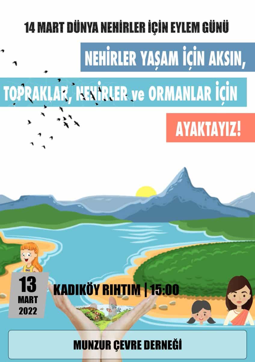 “Tüm üye ve dostlarımızı 13 Mart Pazar saat 15.00’te “Dünya Nehirler Günü” için Kadıköy Rıhtım2da ekoloji örgütleriyle birlikte yapacağımız eyleme katılmaya çağırıyoruz.