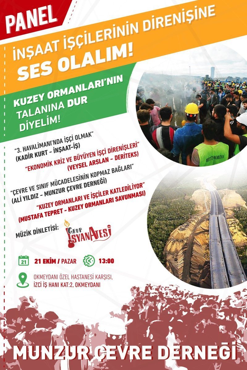Buradan doğru 21 Ekim günü “Kuzey Ormanları’nın talanına ve inşaat işçilerinin direnişine ses olalım” şiarıyla ortak mücadele yol ve yöntemlerini tartışacağımız panele tüm doğa dostlarını ve emekçileri çağırıyoruz.”