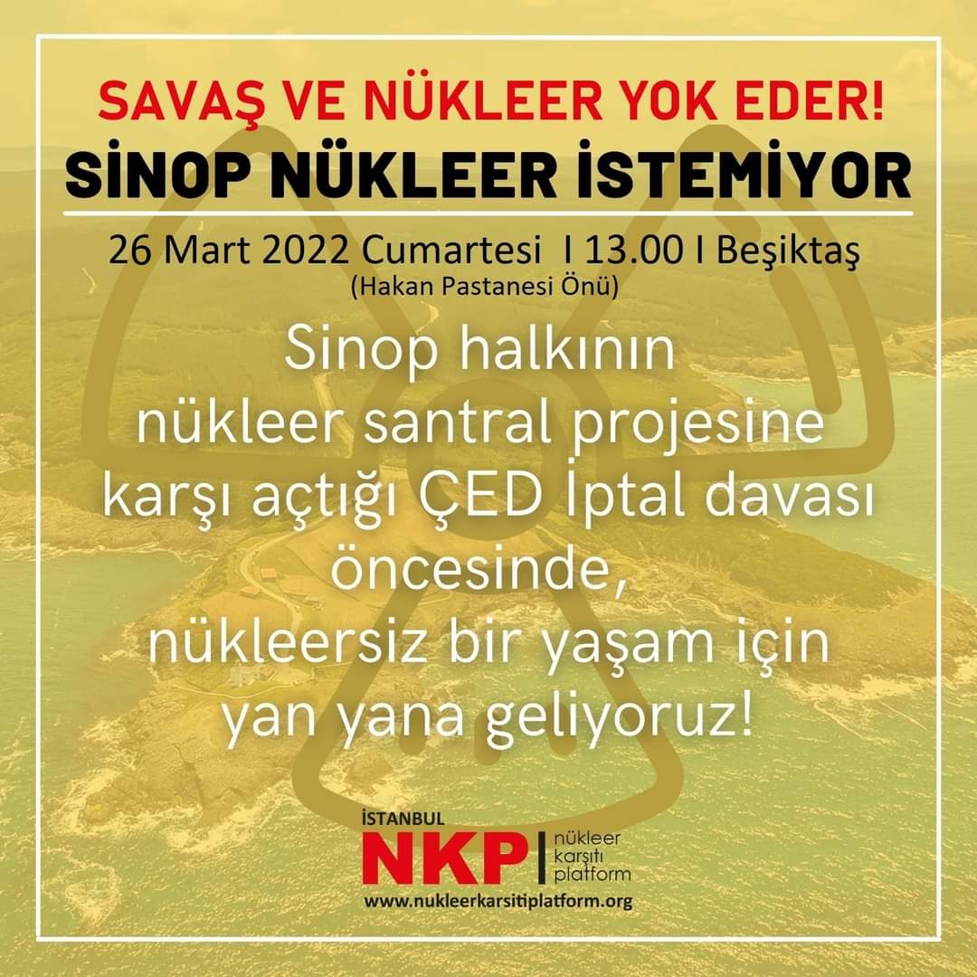 İstanbul Nükleer Karşıtı Platform: “Sinop halkı başta olmak üzere toplamın karşı çıktığı nükleer santrallere karşı 28 Mart günü Samsun’da yapılacak ÇED Yürütmeyi Durdurma Duruşması‘nda biz de İstanbul’dan katılıyor ve haykırıyoruz: Sinop’ta Nükleer İstemiyoruz!” diyerek yapılacak olan basın açıklaması için çağrı yaptı.