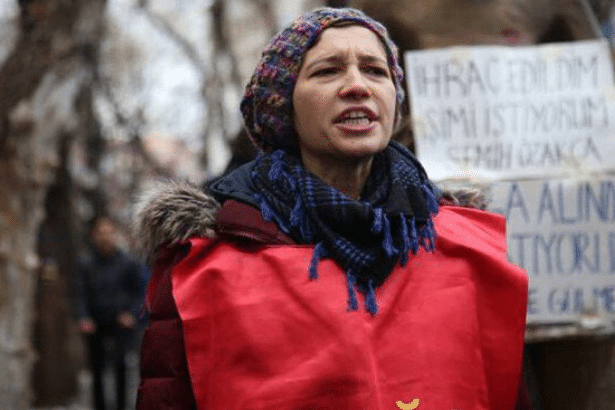 OHAL döneminde çıkarılan KHK ile işten atılan akademisyen Nuriye Gülmen, 3 yıl sonra yeniden Ankara Yüksel Caddesi’nde “İşimizi geri istiyoruz” önlüğüyle eylem yaptı.