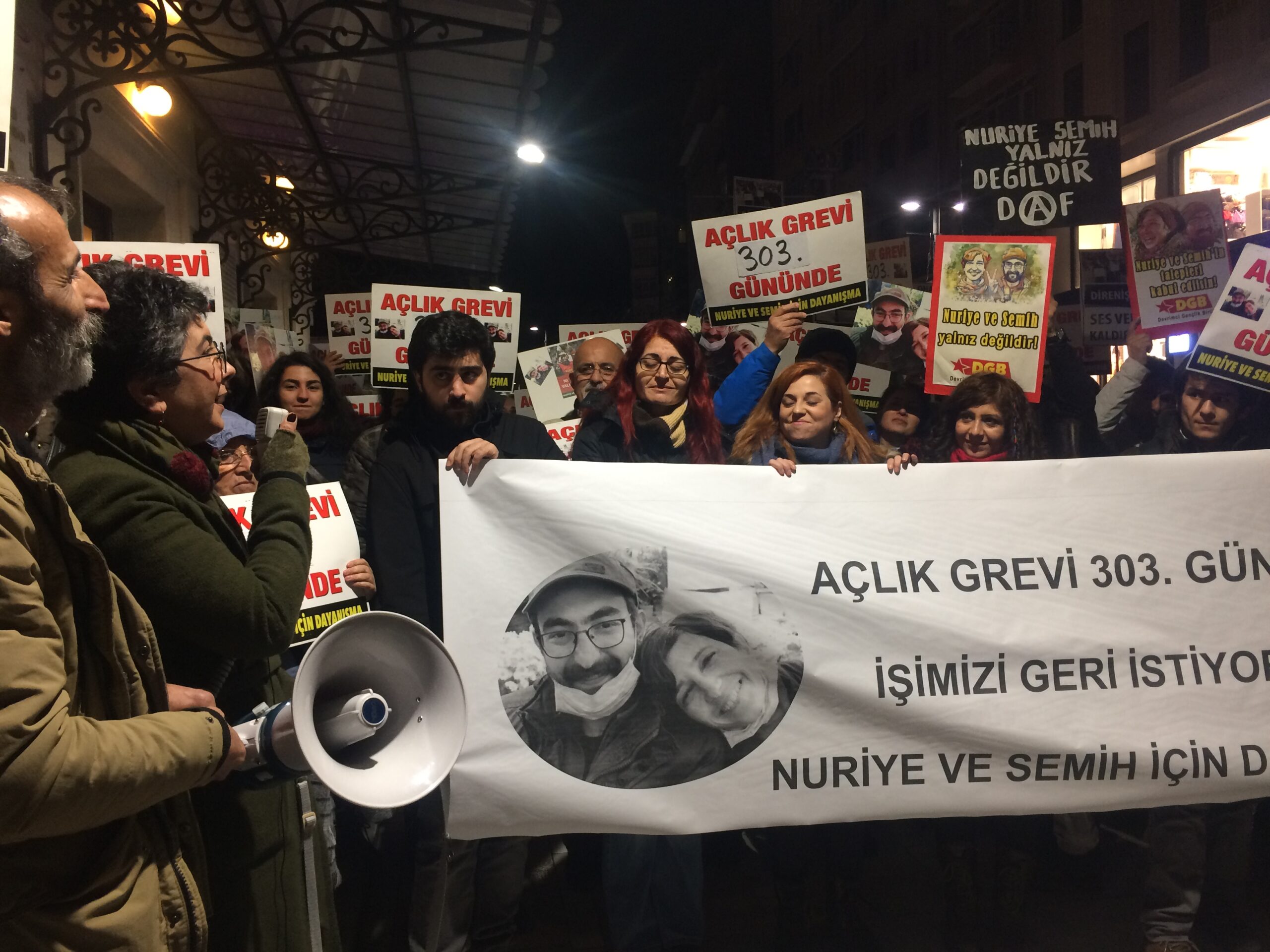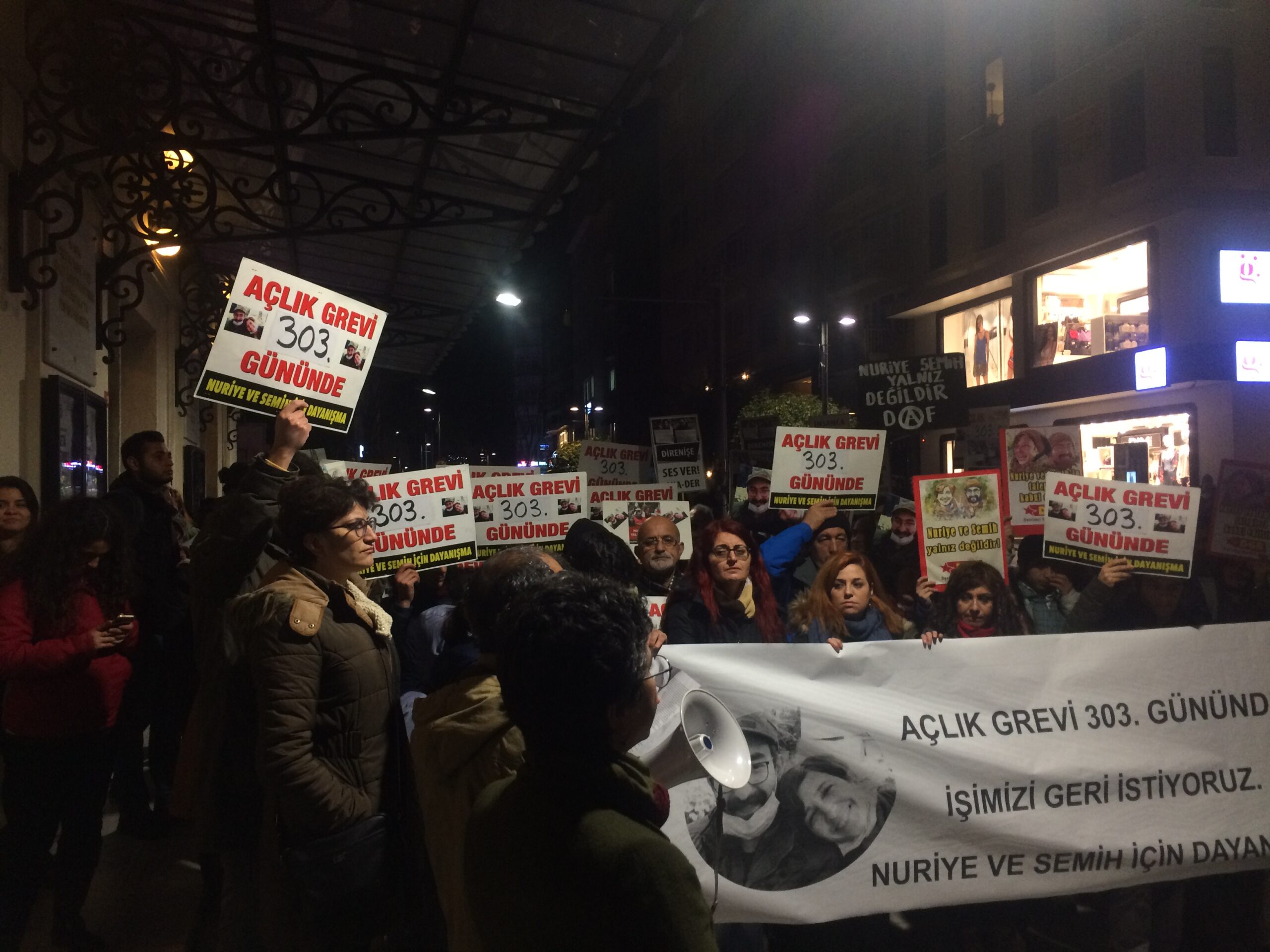 Her cuma olduğu gibi bugün de saat 19.30’da polis ablukası altındaki Süreyya Operası önünde buluşan kitle, “Nuriye, Semih yalnız değildir!”, “KHK’lar gidecek biz kalacağız!” sloganlarını haykırarak eyleme başladılar. “Nuriye ve Semih İçin Dayanışma” imzalı “Açlık grevi 303. gününde. İşimizi geri istiyoruz!” ozaliti açıldı. Eylemde direnişçi kamu emekçileri Nursel Tanrıverdi ve Acun Karadağ konuştu.