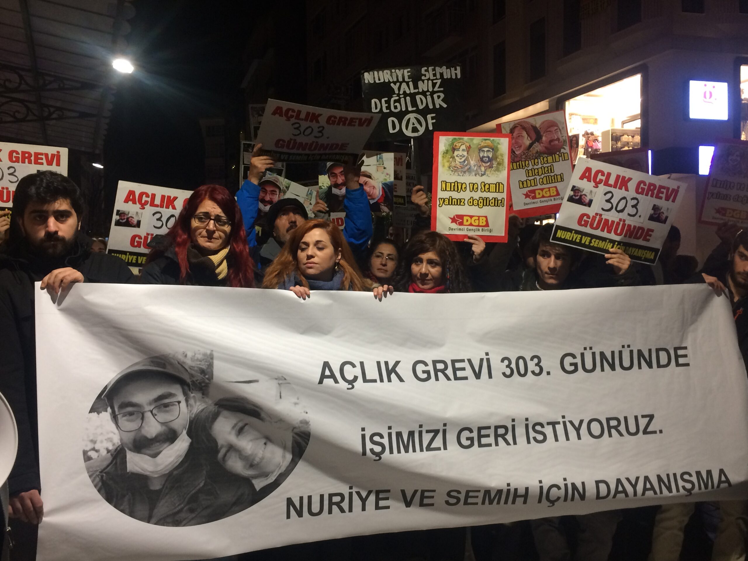 İSTANBUL – OHAL sonrası yayımlanan KHK’lerle ihraç edildikleri işlerine dönmek için başladıkları açlık grevlerinin 303. gününde olan Nuriye Gülmen ve Semih Özakça’nın taleplerinin kabul edilmesi için Nuriye ve Semih İçin Dayanışma’nın çağrısıyla İstanbul Kadıköy’de eylem gerçekleştirildi.
