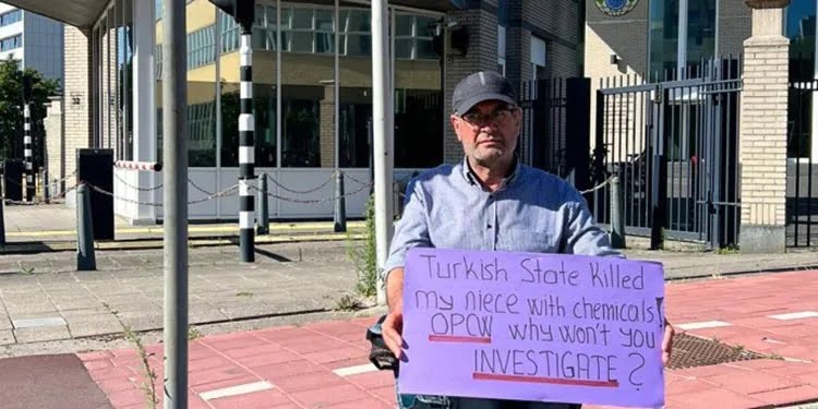 HABER MERKEZİ- Hollanda’nın Lahey kentindeki Kimyasal Silahların Yasaklanması Örgütü’nün (OPCW) binası önünde 5 Ağustos’tan bu yana adalet talebiyle eylem düzenleniyor.
