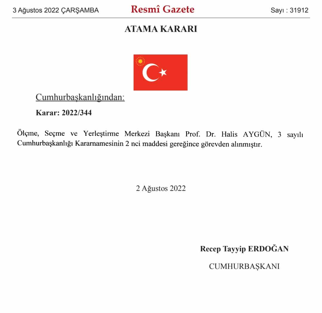 Kararda “Ölçme, Seçme ve Yerleştirme Merkezi Başkanı Prof. Dr. Halis Aygün, 3 sayılı Cumhurbaşkanı Kararnamesinin 2. maddesi gereğince görevden alınmıştır.” denildi.