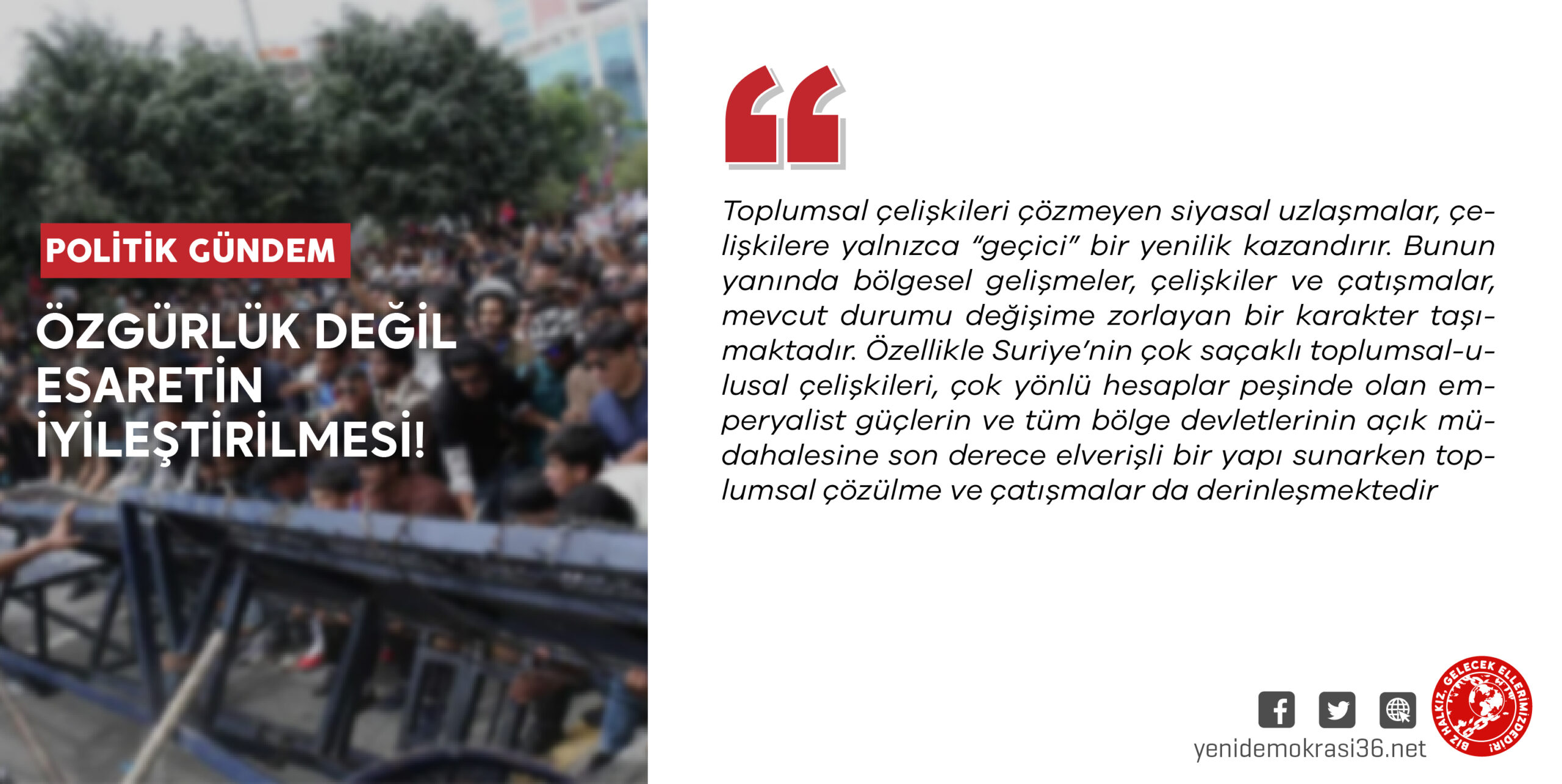 Açıklama oldukça sarih: Bölgede ABD emperyalizminin attığı adımlara uyum sağlanmalı; aksi durumda Kürt meselesi bir varoluş tehdidine dönüşecekti. Bu dönüşüm, daha geniş bölgesel değişimlere hazırlık yapıldığını göstermektedir. Bunun da bölgesel savaş koşullarına uygun bir “içeride ve çeperde cephe tahkimi” olduğu görülmektedir. TC’nin bölgedeki siyasî hegemonyasını ve gerekirse sınırlarını genişletmesine uygun yeni bir gömlek hazırlanmaktadır. İlişkinin özünde bir değişiklik olmaksızın, Kürt Ulusal Hareketiyle sağlanacak bir uzlaşmanın egemen sınıfların çıkarına hizmet edeceği açıktır. Buna karşın yeni durumda da derin toplumsal çelişkiler varlığını koruyacak ve bu durum hareket alanını baştan daraltacaktır. Bilindik Türkiye gerçeği değişmeyecektir.