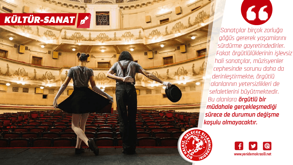 Sanatçılar birçok zorluğa göğüs gererek yaşamlarını sürdürme gayretindedirler. Fakat örgütlülüklerinin işlevsiz hali sanatçılar, müzisyenler cephesinde sorunu daha da derinleştirmekte örgütlü alanlarının yetersizlikleri de sefaletlerini büyütmektedir. Bu alanlara örgütlü bir müdahale gerçekleşmediği sürece de durumun değişme koşulu olmayacaktır. Bu süreç yalnızca pandemi süreci ile ilişkilendirilmemelidir. Müzisyen-sanatçı örgütlülüklerine doğru müdahaleler gerçekleştirilmediğinde ve örgütlü güçleri yükseltilmediğinde sanat cephesinin sorunları katlanarak büyüyecektir.