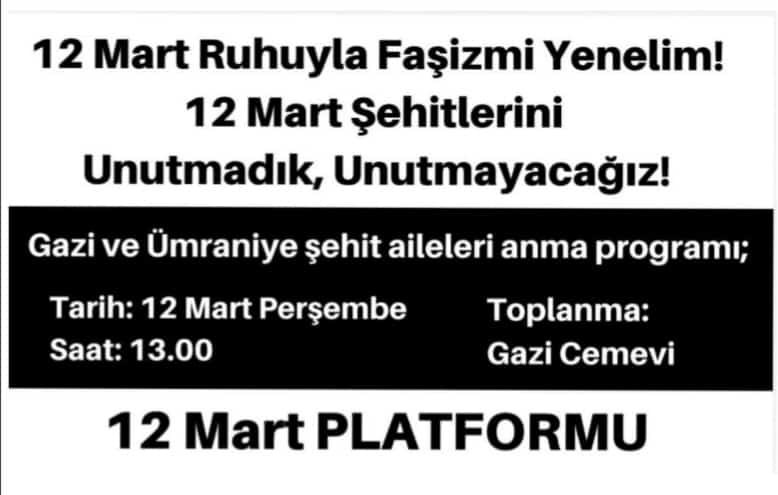 Tüm halkımızı 12 Mart Perşembe günü saat 12.00’de Gazi Cemevi önüne şehitlerimize sahip çıkmaya 12 Mart Platformu saflarına çağırıyoruz.
